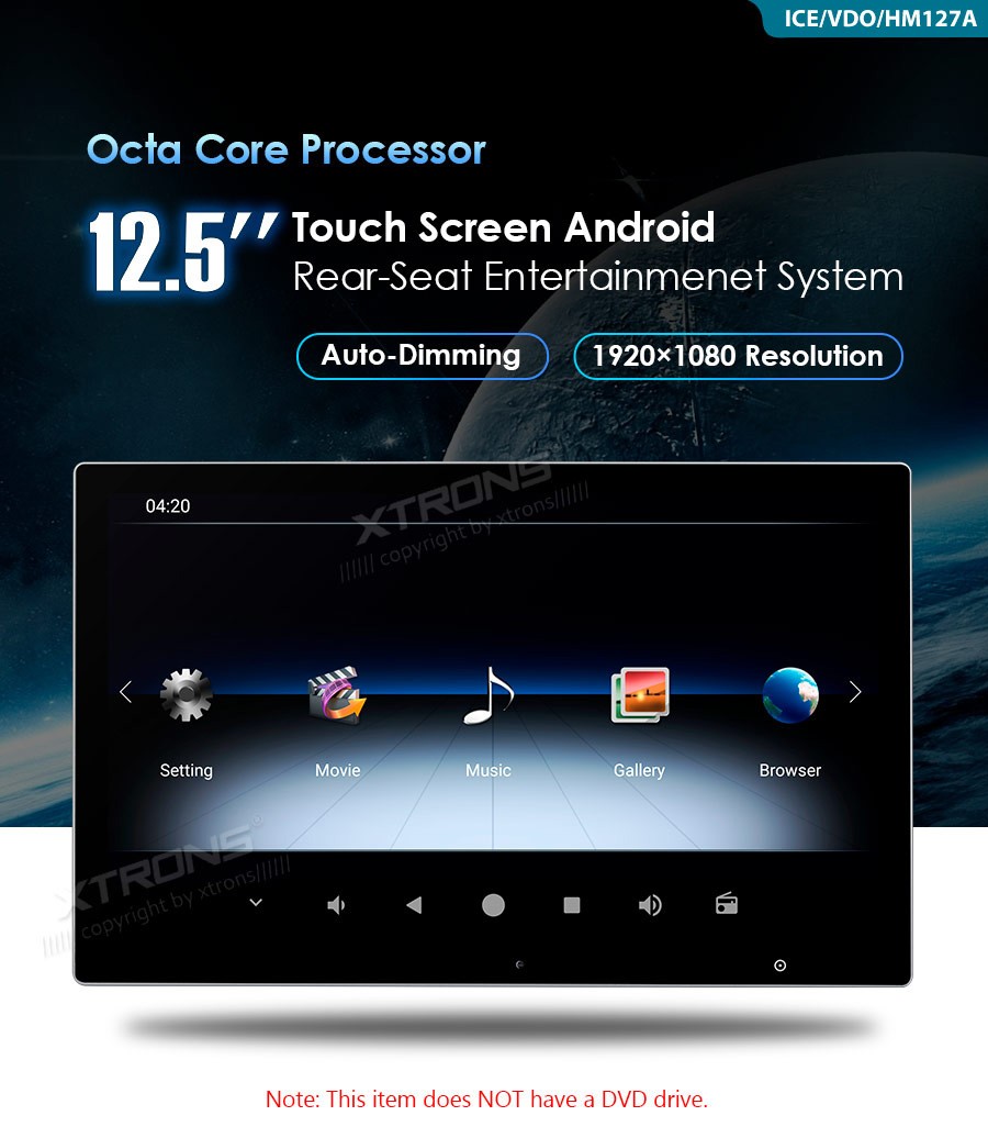 Xtrons HM127A 12.5" Puuteekraaniga peatoemonitoor, HDMI, Android 10.0Tarkvara: Android 10.012.5" HD puuteekraan 1920*1080pxProtsessor  Cortex-A53 Octa-Core 64bitMuutmälu 2GB, 16GB sisemäluWIFI sisseehitatudHDMI sisend / väljundEi sisalda Audi/Video sisendid/väljundidSD mälukaardi ja USB tugi (FAT32) ...