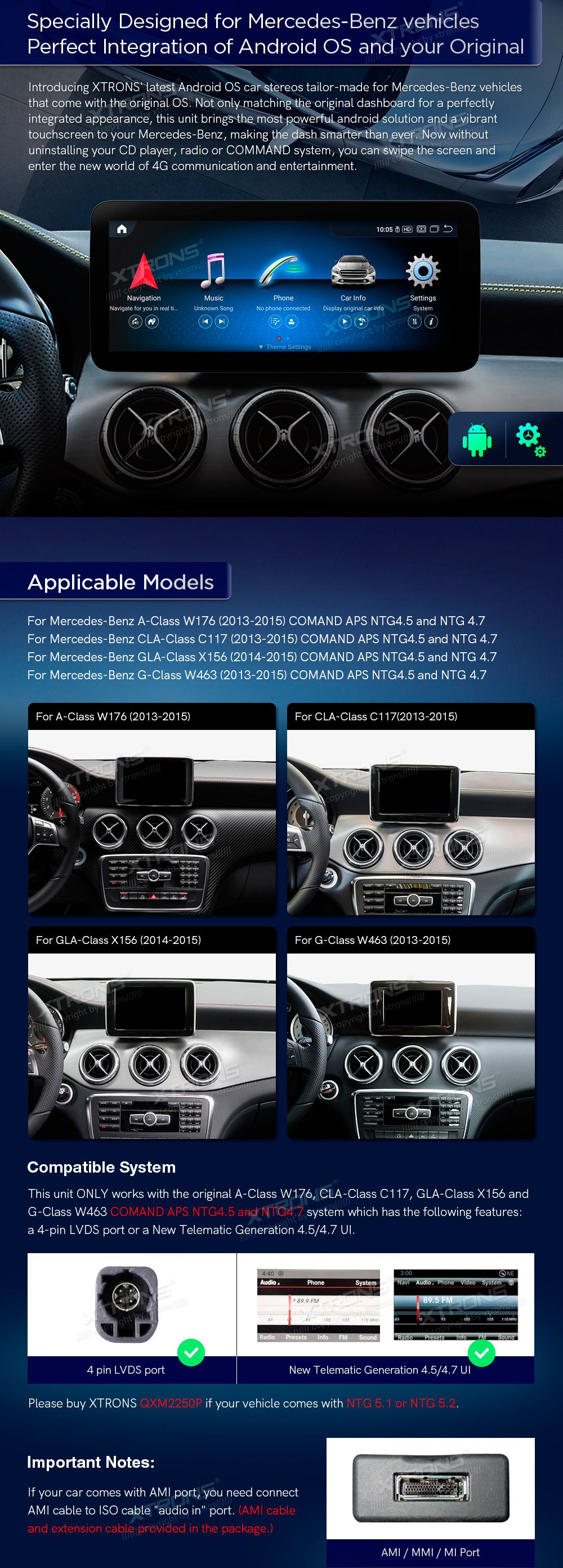 XTRONS QXM2245P 12.3" Mercedes-Benz Multimeedia Android 12.0 Octa-Core Mercedes-BenzA-Class W176(2013-2015) NTG 4.5 and NTG 4.7 System. CLA-Class C117(2013-2015)NTG 4.5 and NTG 4.7 System. GLA-Class X156(2014-2015) NTG 4.5 and NTG 4.7 System.G-Class W463(2013-2015) NTG 4.5 and NTG 4.7 Syst ...