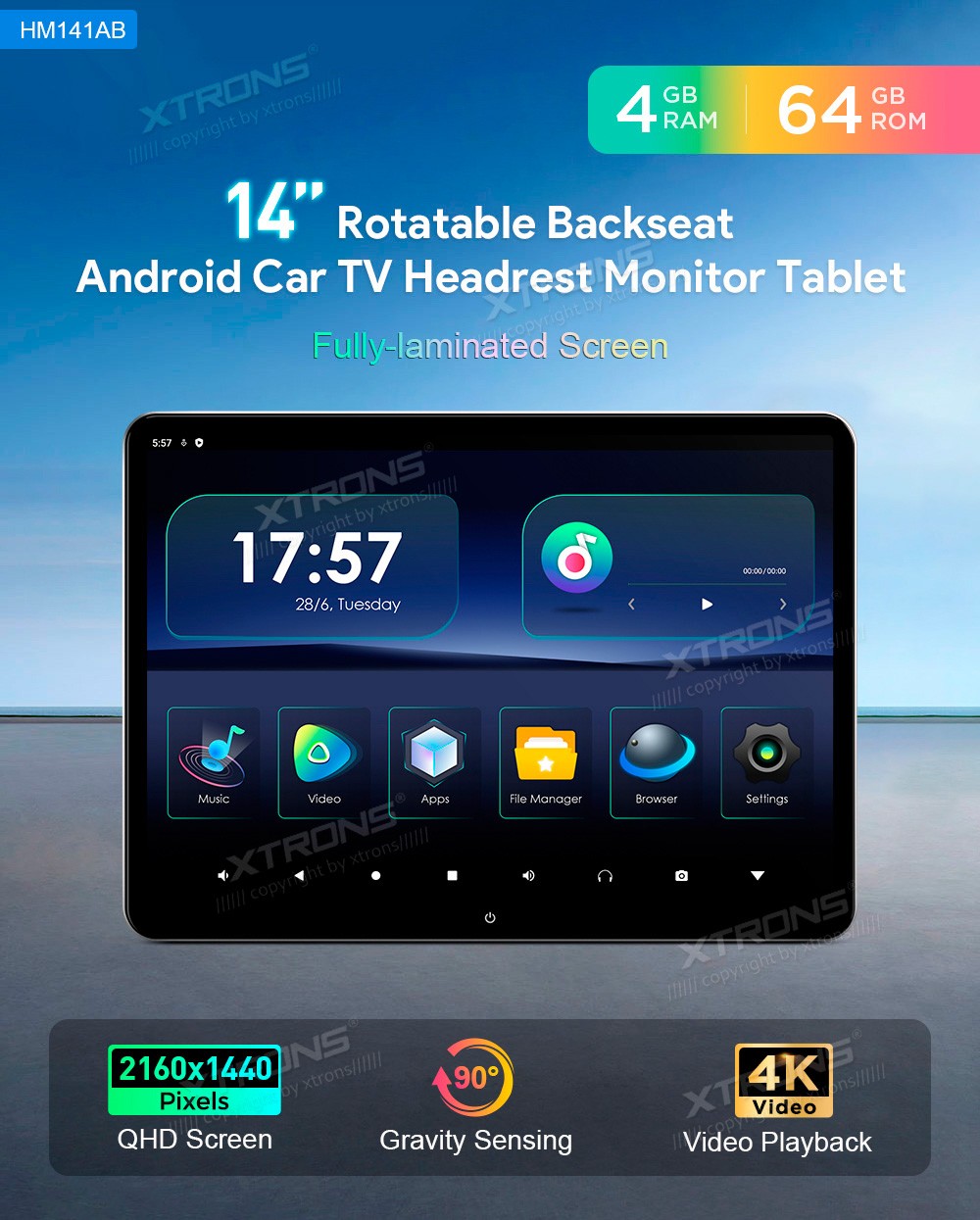 Xtrons HM141AB 14.0" Puuteekraaniga peatoemonitoor, HDMI, Android 11.0Tarkvara: Android 11.014.0" HD puuteekraan 2160*1440px, IPSProtsessor Rockchip RK3566  Cortex-A55 Quad-Core 64bit @1.8GHzMuutmälu 4GB, 64GB sisemäluWIFI sisseehitatud (2.4GHz ja 5.0GHz)3G & 4G (vajalik XTRONS 4GDONG001)HD ...
