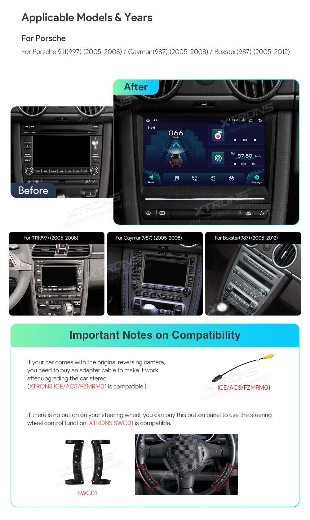 XTRONS IA82CMPLS 8.0" Porsche Multimeedia Android 13.0 Octa-Core Porsche 911 (997) (2005-2008)/Cayman(987) (2005-2008)/Boxster(987) (2005-2012)Tarkvara: Android 13.09.0" HD puuteekraan 1280*720px, IPSProtsessor MediaTek Cortex-A73(2.0GHz)x2 + Cortex-A53(1.7GHz)x6 Octa-Core 64bitMuutmälu 4GB DDR ...