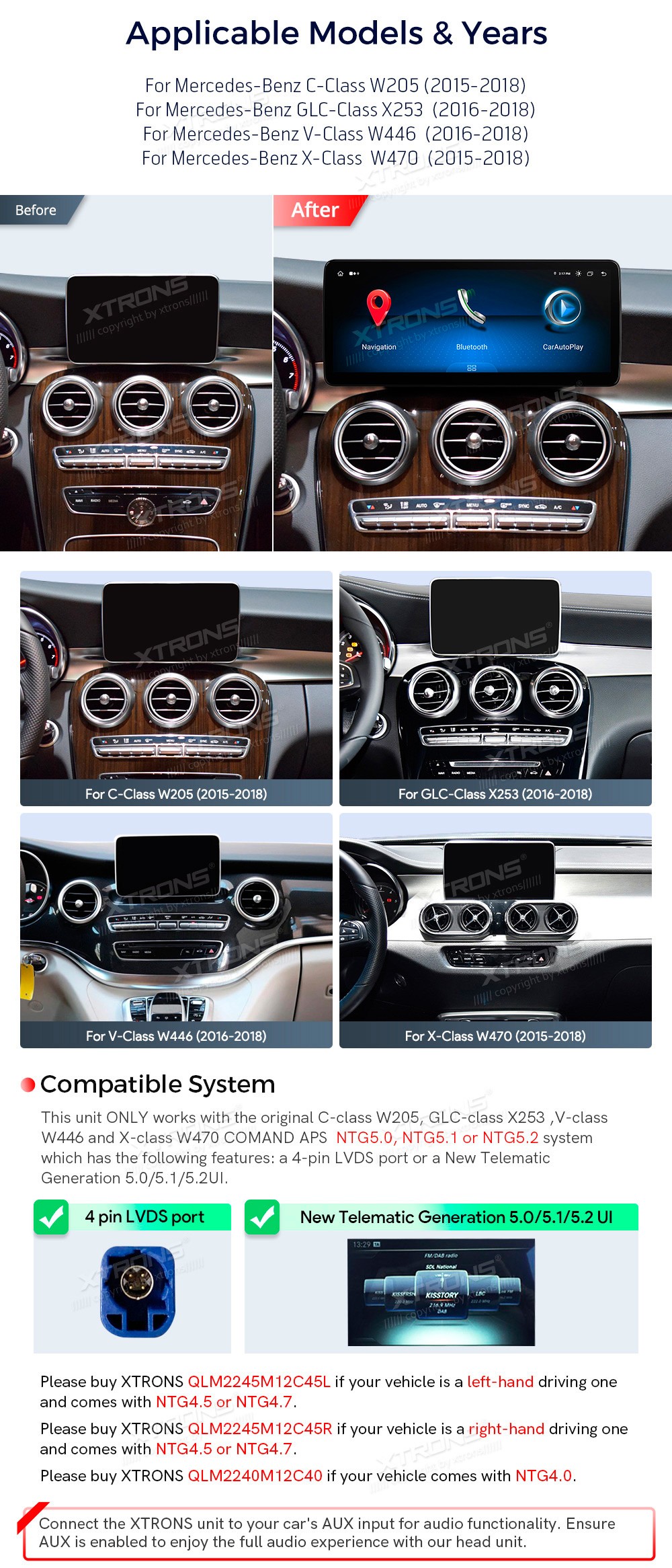 XTRONS QLM2250M12C5 12.3" Mercedes-Benz W205, W446, W470, X253 Multimeedia Android 13.0 Octa-CoreMercedes-BenzC-Class W205 (2015-2018) NTG 5.0, NTG 5.1, NTG 5.2GLC-Class X253 (2016-2018) NTG 5.0, NTG 5.1, NTG 5.2 V-Class W446 (2016-2018) NTG 5.0, NTG 5.1, NTG 5.2X-Class W470(2015-2018) NTG 5.0, NTG ...