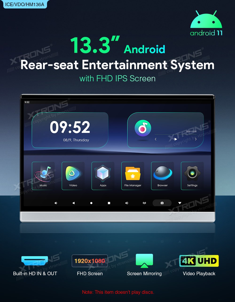 XTRONS HM136A 13.3" Puuteekraaniga peatoemonitoor, HDMI, Android 11.0Tarkvara: Android 11.013.3" HD puuteekraan 1920*1080px, IPSProtsessor Rockchip RK3566  Cortex-A55 Quad-Core 64bit @1.8GHzMuutmälu 2GB, 32GB sisemäluWIFI sisseehitatud (2.4GHz ja 5.0GHz)HDMI sisend / väljundRCA Audio sisend - J ...
