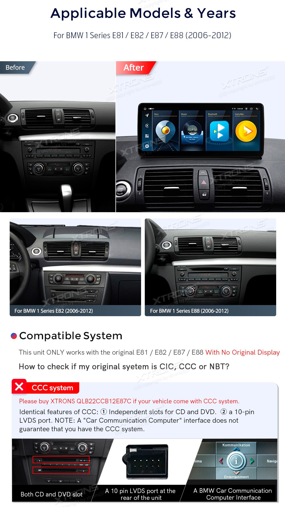 XTRONS QLB22UMB12E87L 12.3" BMW 1, E81, E82, E87, E88 Multimeedia Android 13.0 Octa-Core BMW 1 Series E81, E82, E87, E88 (2006-2012)  (Kui autol puudub originaalne ekraan.)Tarkvara: Android 13.012.3" HD puuteekraan 1920*720px, IPS HDProtsessor Octa-Core 2xCortex-A75 2.0GHz + 6xCortex-A55 1 ...