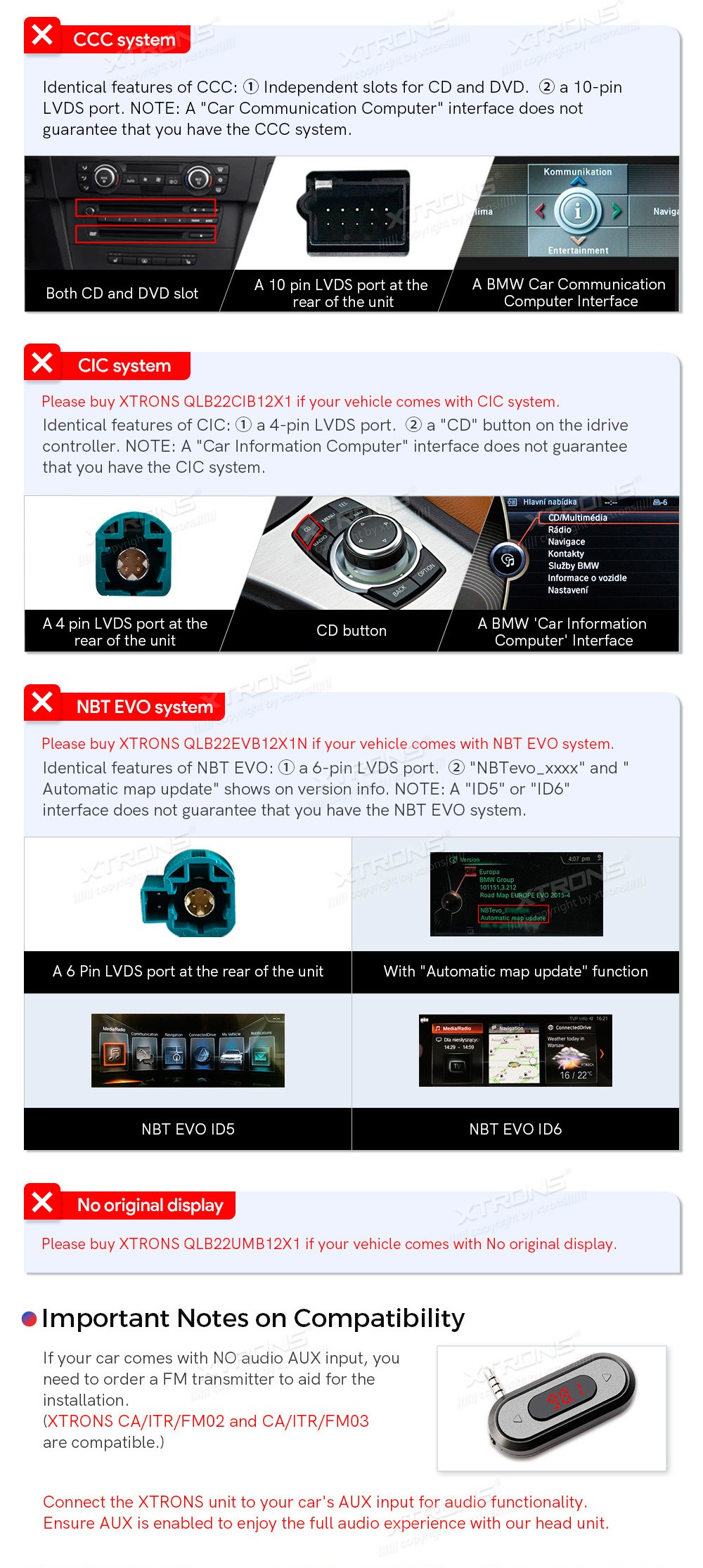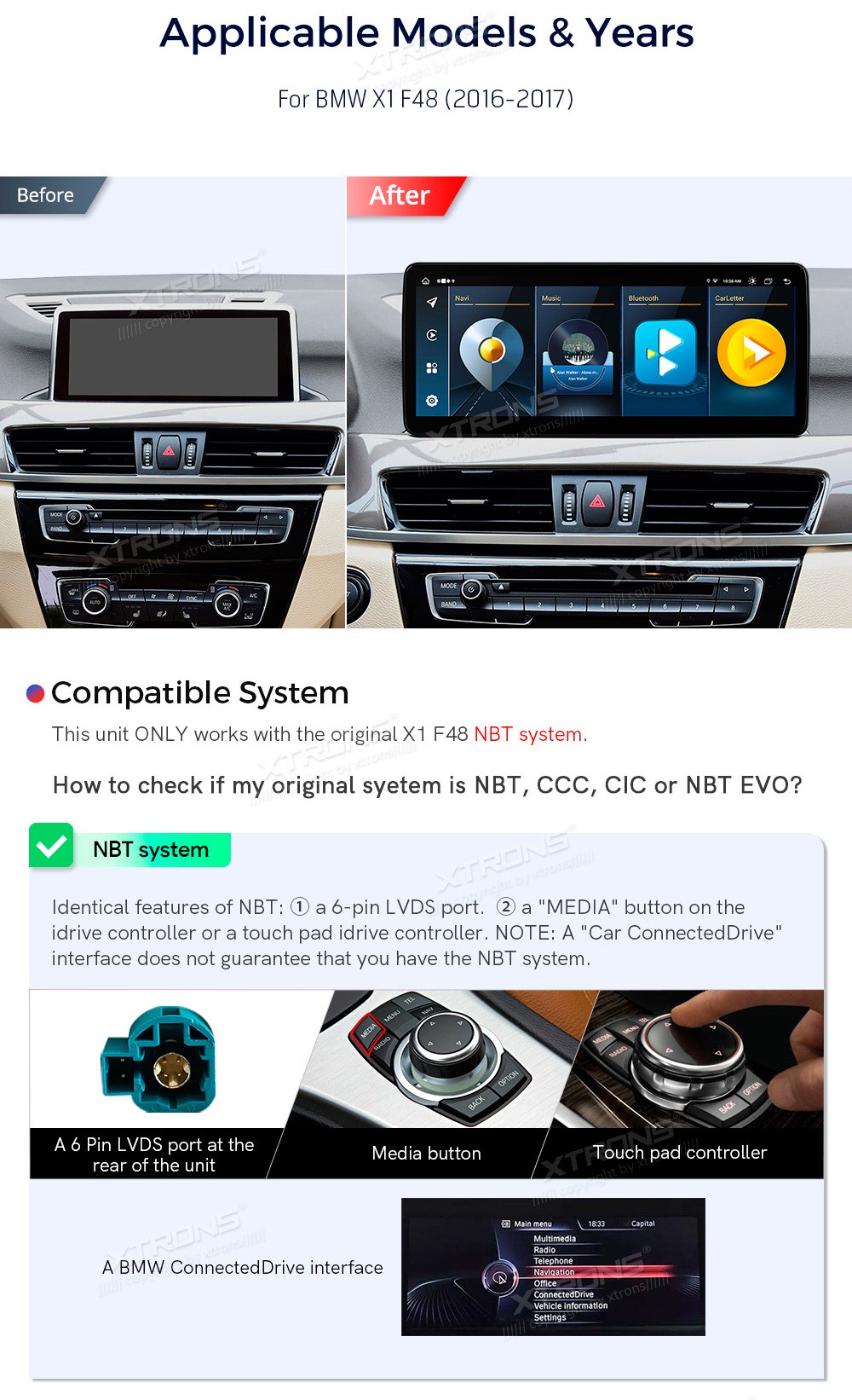 XTRONS QLB22NB12X1N 12.3" BMW X1 F48 NBT Multimeedia Android 13.0 Octa-Core BMW X1 F48 (2016-2017) (Sobib, kui sõidukil on NBT süsteem.)Tarkvara: Android 13.012.3" HD puuteekraan 1920*720px, IPS HDProtsessor Octa-Core 2xCortex-A75 2.0GHz + 6xCortex-A55 1.7GHz 64bitMuutmälu DDR4 4GB, SSD 64GB si ...