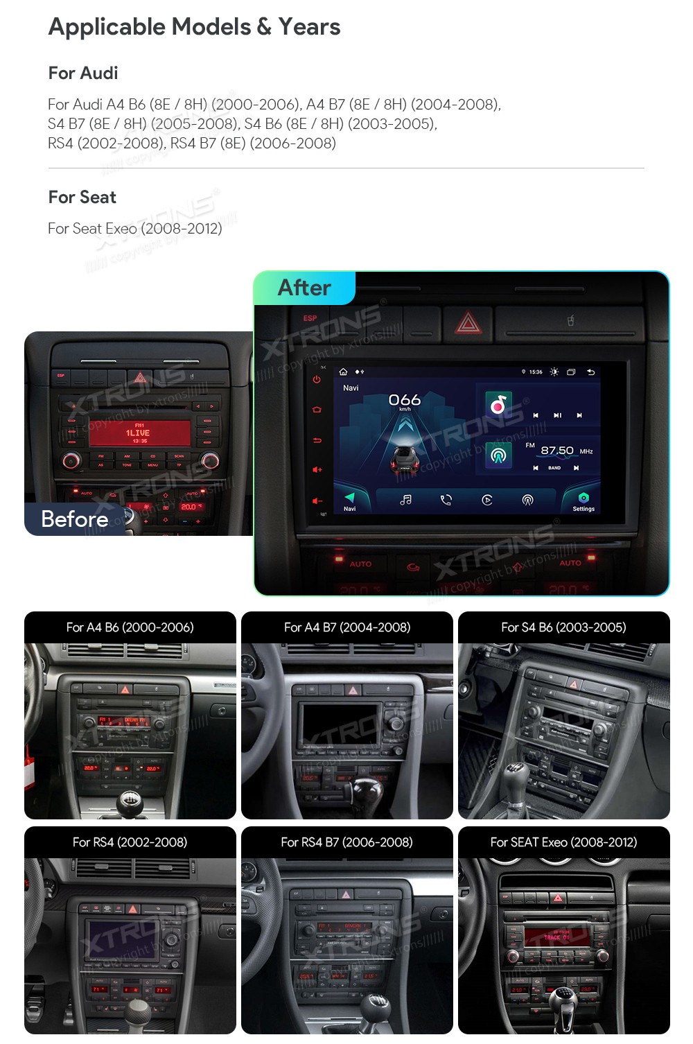 XTRONS IA82A4ALS 8.0" AUDI, SEAT Multimeedia Android 12.0 Octa-Core Audi A4 B6 (8E / 8H) (2000-2006), A4 B7 (8E / 8H) (2004-2008), S4 B7 (8E / 8H) (2005-2008), S4 B6 (8E / 8H) (2003-2005), RS4 (2002-2008), RS4 B7 (8E) (2006-2008), SEAT Exeo (2008-2012)Tarkvara: Android 12.08.0" HD puuteekra ...
