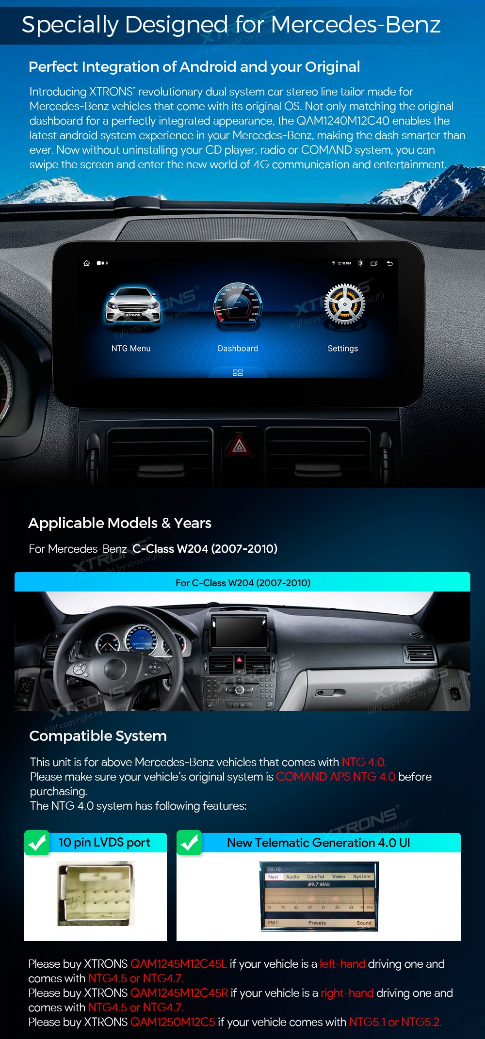 XTRONS QAM1240M12C40 10.25" Mercedes-Benz C-Class W204 Multimeedia Android 13.0 Octa-Core Mercedes-BenzC-Class W204 (2007-2010) NTG 4.0Tarkvara: Android 13.010.25" HD puuteekraan 1920*720px, IPS G+G HDProtsessor Octa-Core 2xCortex-A75 2.0GHz + 6xCortex-A55 1.7GHz 64bitMuutmälu DDR4 8GB, SSD 128 ...