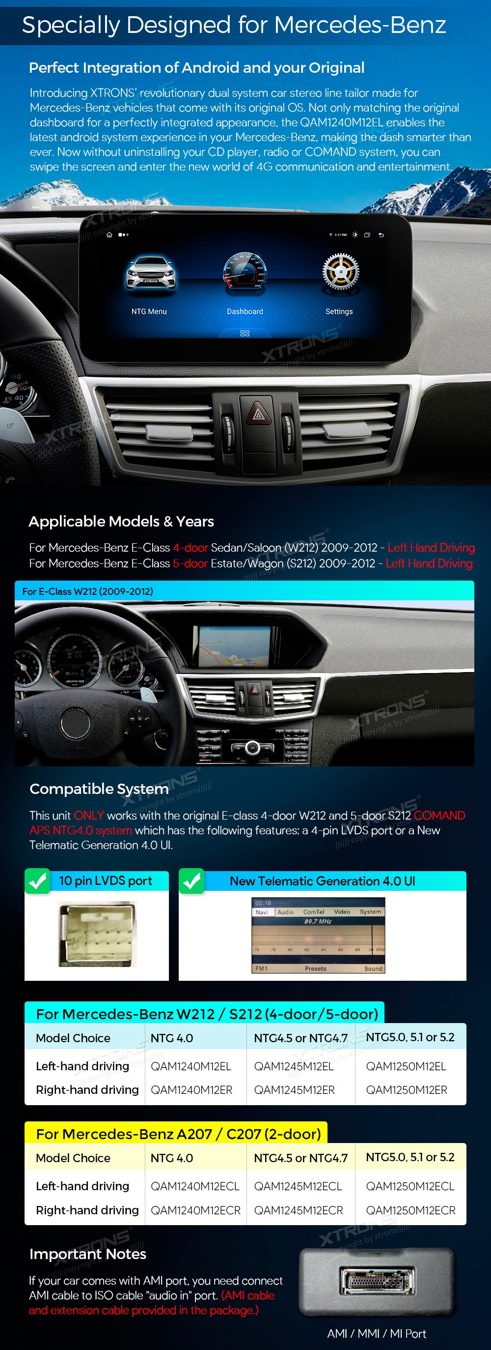 XTRONS QAM1240M12EL 10.25" Mercedes-Benz E-Class W212, S212 Multimeedia Android 13.0 Octa-Core Mercedes-BenzE-Class W212(2009-2012) NTG 4.0E-Class S212(2009-2012) NTG 4.0Tarkvara: Android 13.010.25" HD puuteekraan 1920*720px, IPS G+G HDProtsessor Octa-Core 2xCortex-A75 2.0GHz + 6xCortex-A55 1.7 ...