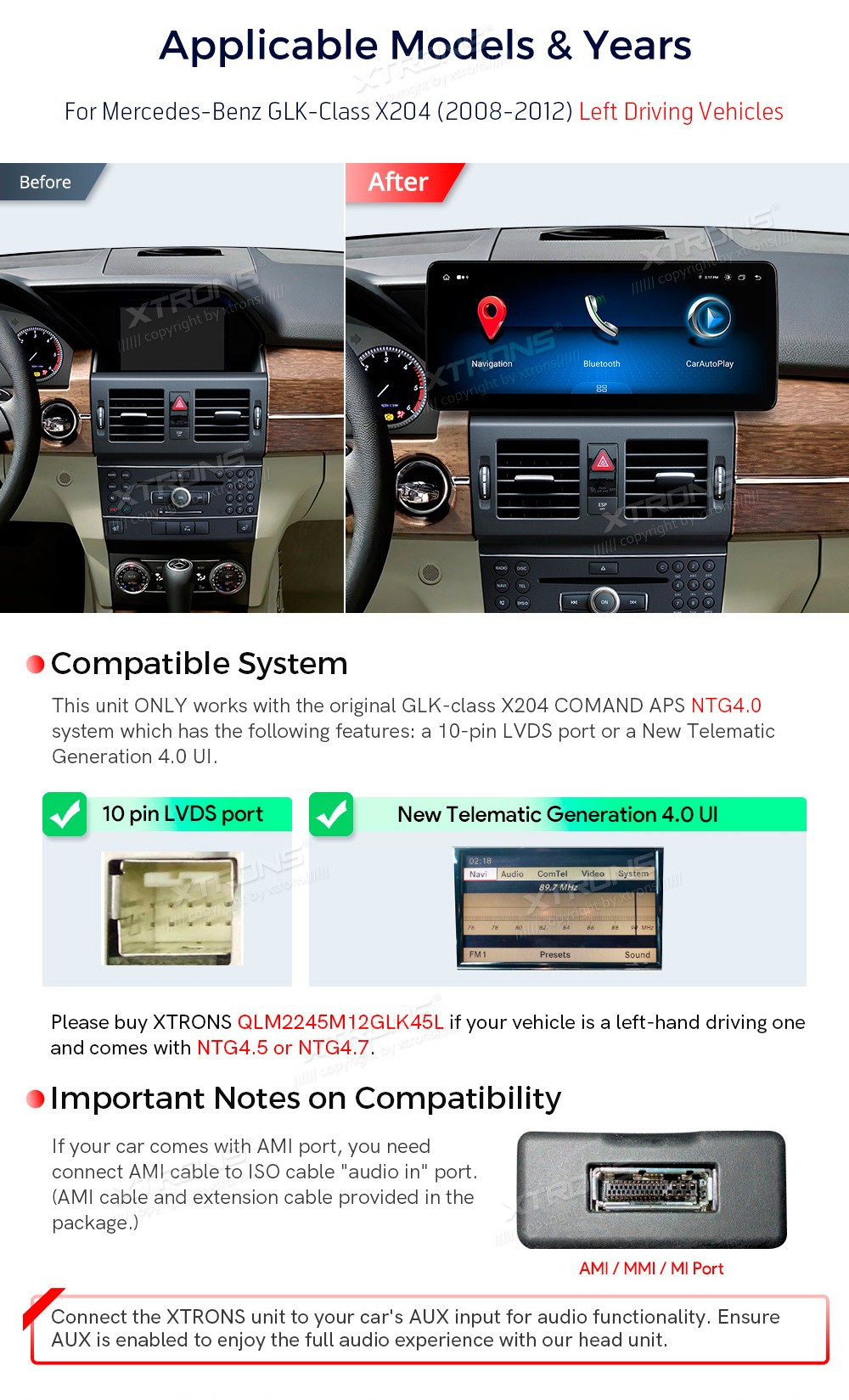 XTRONS QLM2240M12GLK40L 12.3" Mercedes-Benz GLK-Class X204 Multimeedia Android 14.0 Octa-Core Mercedes-Benz GLK-Class X204 (2008-2012) NTG 4.0Tarkvara: Android 14.012.3" HD puuteekraan 1920*720px, IPS HDProtsessor Octa-Core 2xCortex-A75 2.0GHz + 6xCortex-A55 1.7GHz 64bitMuutmälu DDR4 4GB, SSD 6 ...