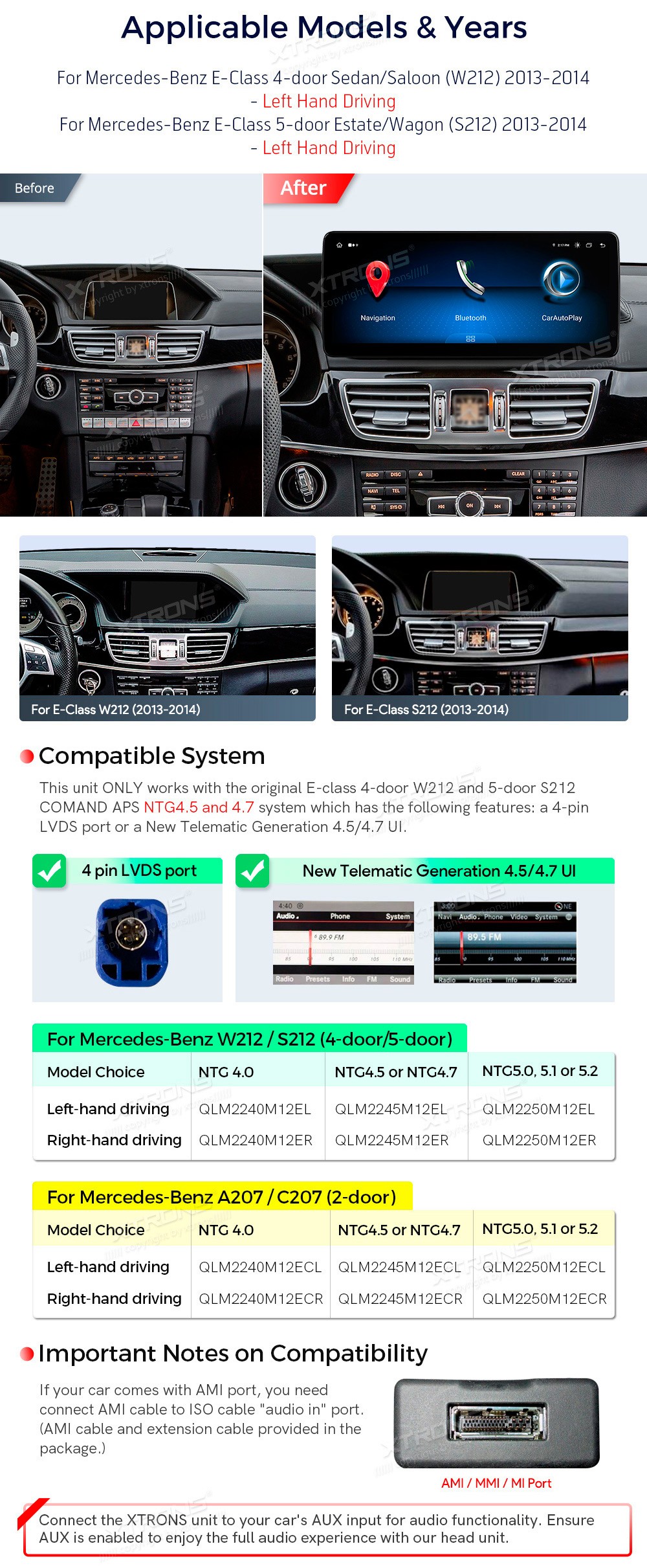 XTRONS QLM2245M12EL 12.3" Mercedes-Benz E-Class W212, S212 Multimeedia Android 14.0 Octa-CoreMercedes-BenzE-Class 4-door Sedan/Saloon (W212) (2013-2014) NTG 4.5, NTG 4.7E-Class 5-door Estate/Wagon (S212) (2013-2014) NTG 4.5, NTG 4.7Tarkvara: Android 14.012.3" HD puuteekraan 1920*720px, IPS HDProtses ...