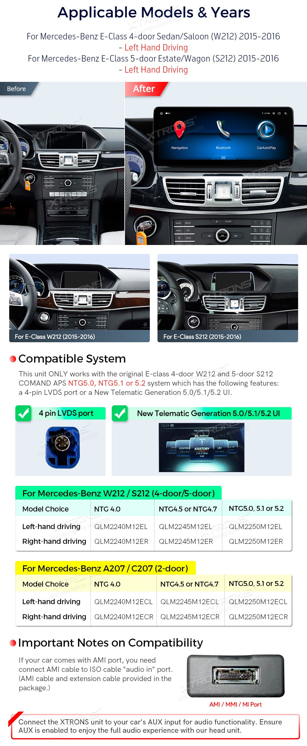 XTRONS QLM2250M12EL 12.3" Mercedes-Benz E-Class W212, S212 Multimeedia Android 14.0 Octa-Core Mercedes-BenzE-Class 4-door Sedan/Saloon (W212) (2015-2016) NTG 5.0, NTG 5.1, NTG 5.2E-Class 5-door Estate/Wagon (S212) (2015-2016) NTG 5.0, NTG 5.1, NTG 5.2Tarkvara: Android 14.012.3" HD puuteekraan 1 ...