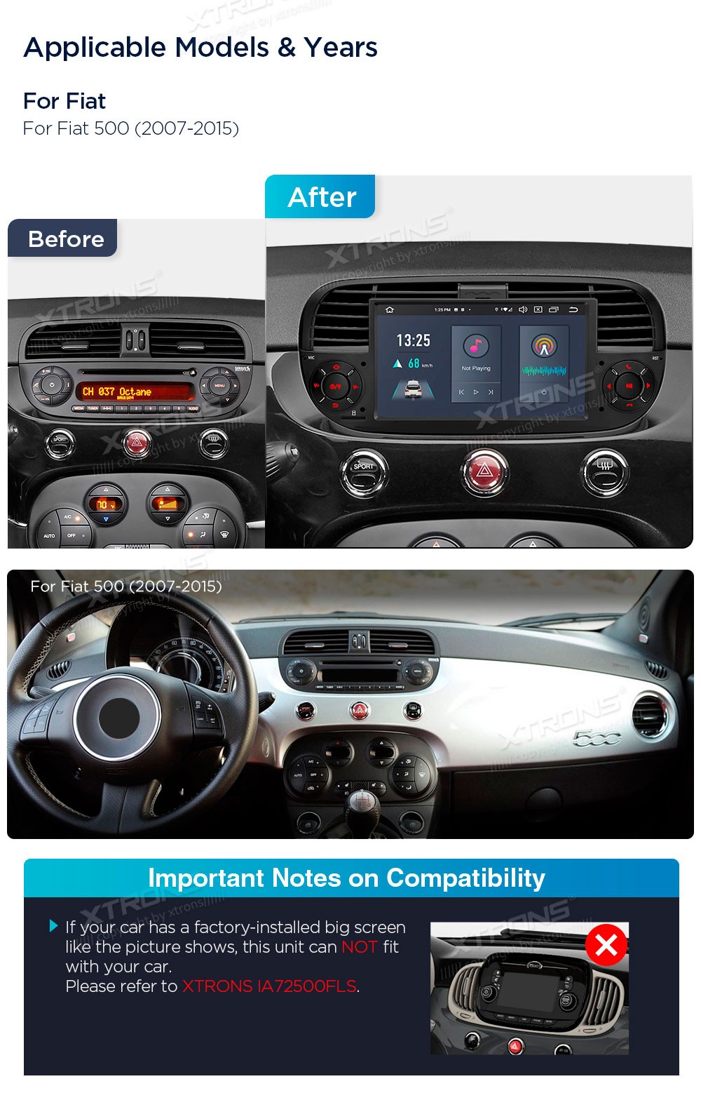 XTRONS PXS7250FBL 7.0" FIAT 500 Multimeedia Android 13.0 Octa-Core FIAT 500 (2007-2015)Tarkvara: Android 13.07.0" HD puuteekraan 1024*600px, IPSProtsessor  Octa-Core 64bit 2.0GHzMuutmälu 2GB DDR4, 32GB EMMC 5.1 sisemäluGPS NavigatsioonCAR AutoPlay (Bluetooth) AndroidAuto (Bluetooth ja juht ...
