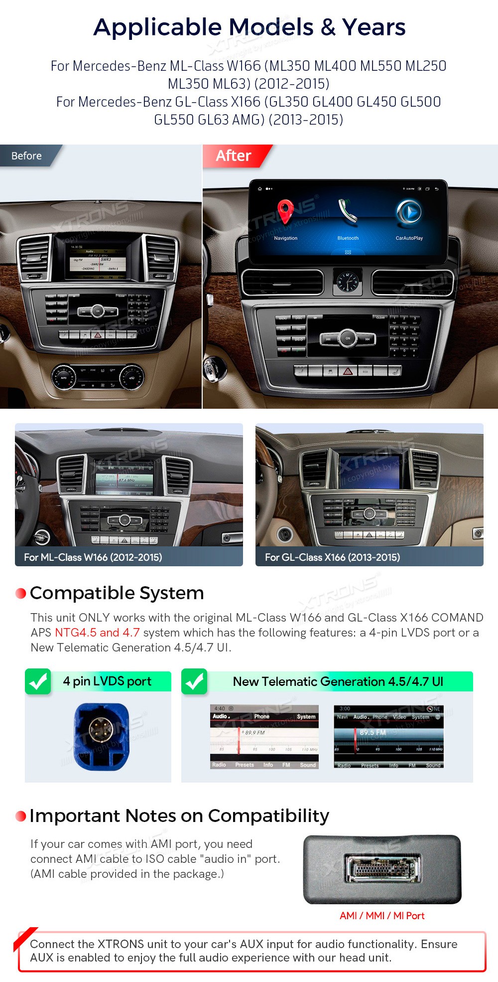 XTRONS QLM2245M12ML45 12.3" Mercedes-Benz W166, X166 Multimeedia Android 14.0 Octa-CoreMercedes-BenzML-Class W166 (ML350, ML400, ML550, ML250, ML63) (2012-2015) NTG 4.5, NTG 4.7GL-Class X166 (GL350, GL400, GL450, GL500, GL550, GL63) (2013-2015) NTG 4.5, NTG 4.7Tarkvara: Android 14.012.3" HD puuteekr ...