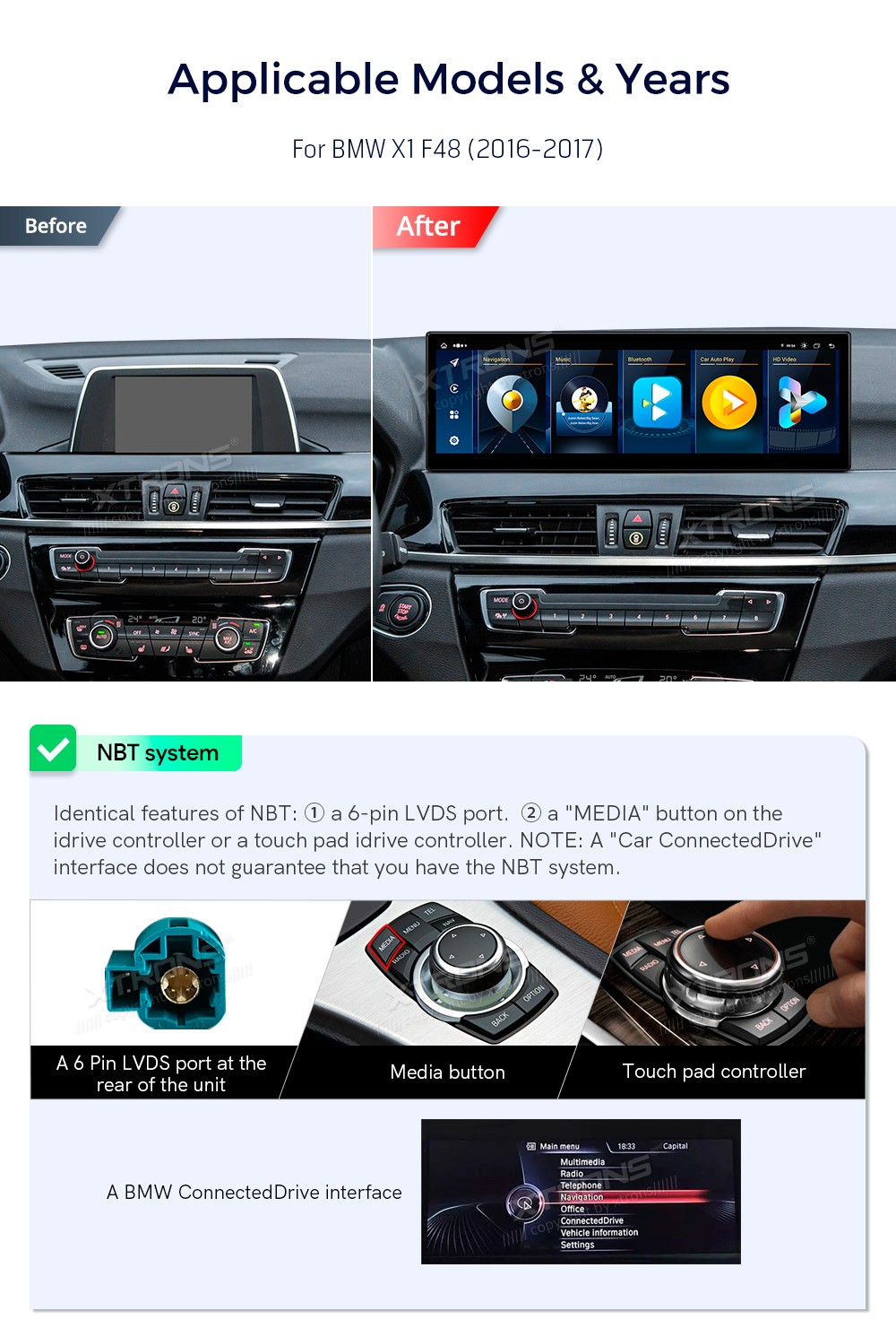 XTRONS QLB42X1NB 14.9" BMW X1 F48 NBT Multimeedia Android 13.0 Octa-Core 4G BMW X1 F48 (2016-2017)(Sobib, kui sõidukil on NBT süsteem.)Tarkvara: Android 13.014.9" HD puuteekraan 2560*720px, IPS HDProtsessor Octa-Core 2xCortex-A75 2.0GHz + 6xCortex-A55 1.7GHz 64bitMuutmälu DDR4 4GB, SSD 64GB sis ...