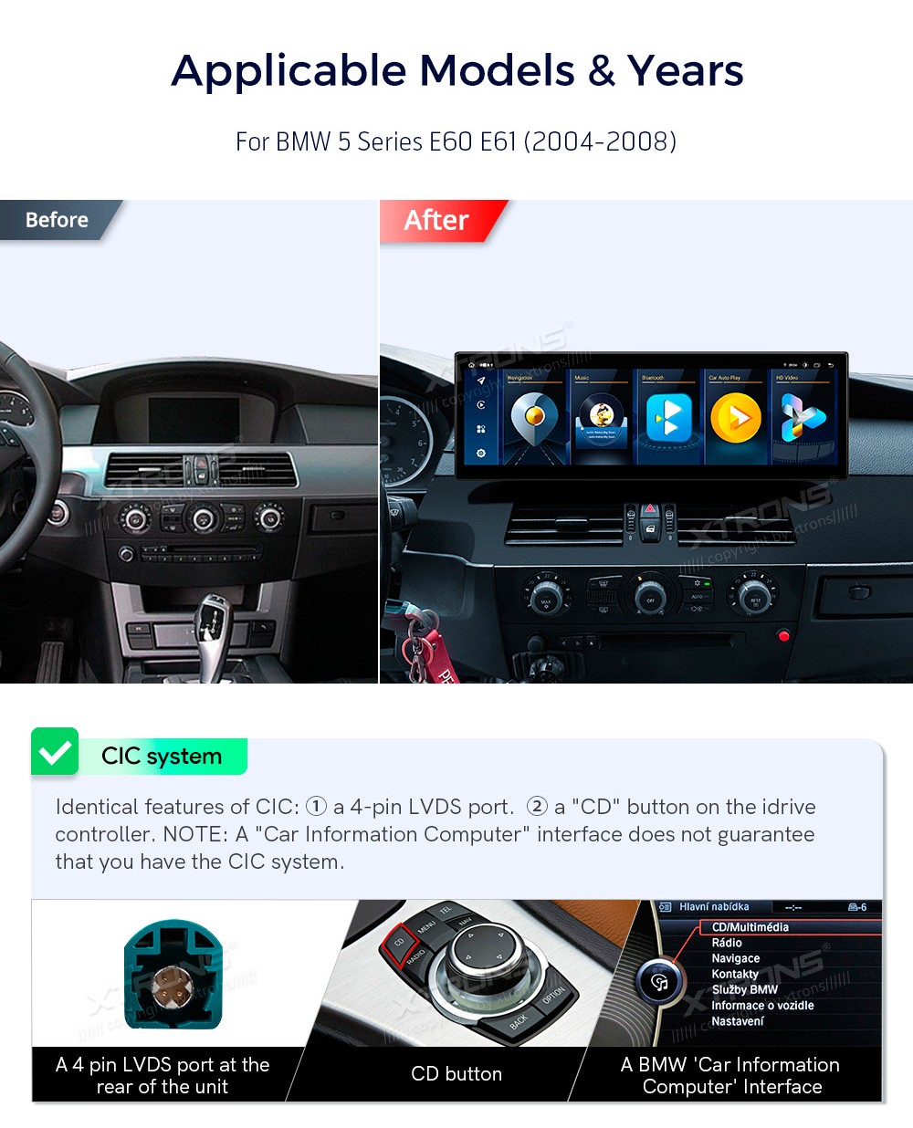 XTRONS QLB4260CI 14.9" BMW 5 E60, E61, CIC Multimeedia Android 14.0 Octa-Core 4G BMW 5 Series E60 E61 (2004-2008) (Sobib, kui sõidukil on CIC süsteem.)Tarkvara: Android 14.014.9" HD puuteekraan 2560*720px, IPS HDProtsessor Octa-Core 2xCortex-A75 2.0GHz + 6xCortex-A55 1.7GHz 64bitMuutmälu DDR4 4 ...