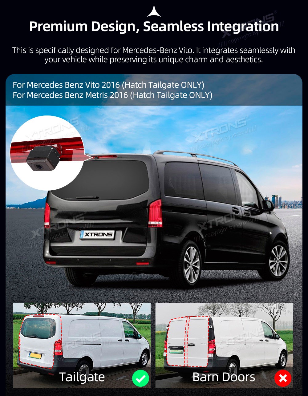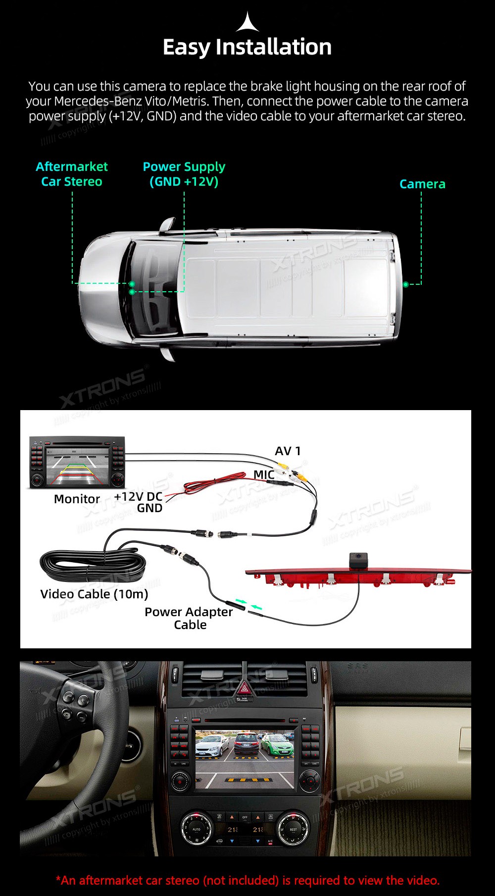 XTRONS ACCAMMBV001 Mercedes-Benz Vito Tailgate 2016 KaameraVaatenurk: 145ºVideo režiim: NTSC / PALFormaat: 976*592px, 700TVL, 0.1LuxTööpinge: +12VVideo väljundMikrofooni väljundTöötemperatuur: -20ºC~+70ºCVeekindlus: IP69K ...