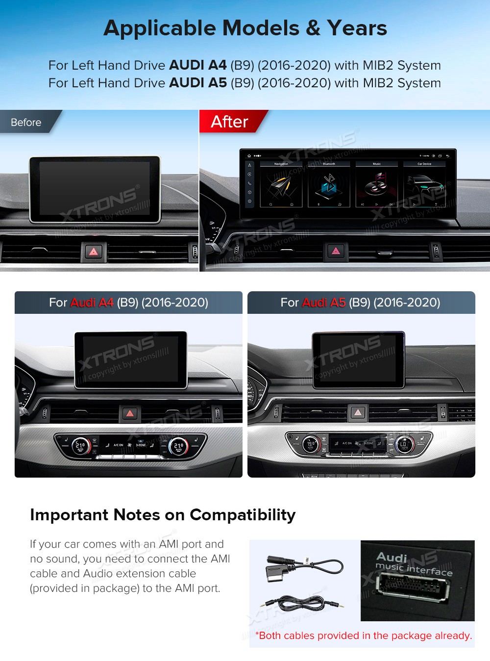 XTRONS QLA42A4NL 14.9" AUDI A4 B9 Multimeedia Android 13.0 Octa-Core 4G Audi A4 (B9) (2016-2020) MIB2Audi A5 (B9) (2016-2020) MIB2Tarkvara: Android 13.014.9" HD puuteekraan 2560*720px, IPS HDProtsessor Octa-Core 2xCortex-A75 2.0GHz + 6xCortex-A55 1.7GHz 64bitMuutmälu LPDDR4 4GB, eMMC 64GB sisem ...