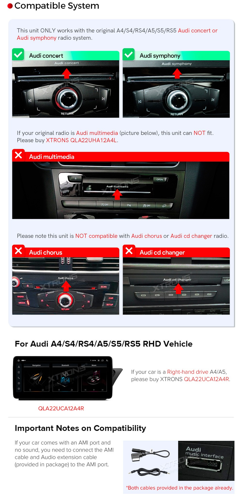 XTRONS QLA22UCA12A4L 12.3" AUDI A4, A5 B8 Multimeedia Android 13.0 Octa-Core 4G Audi A4, S4 (B8) (2009-2016), RS4 (B8) (2012-2015)Audi A5, S5 (B8) (2008-2016), RS5 (B8) (2010-2015)Tarkvara: Android 13.012.3" HD puuteekraan 1920*720px, IPS HDProtsessor Octa-Core 2xCortex-A75 2.0GHz + 6xCortex-A5 ...