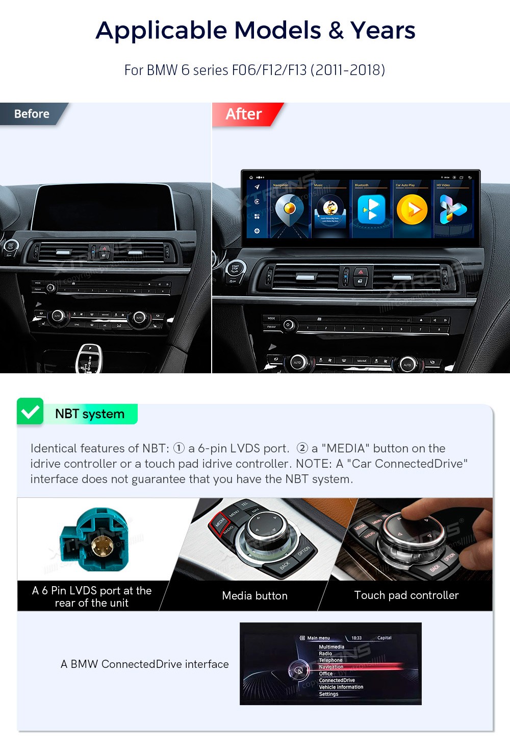 XTRONS QLB42SXNB 14.9" BMW 6 F06, F12, F13 NBT Multimeedia Android 13.0 Octa-Core 4G BMW 6 Seeria F06, F12, F13 (2011-2018)(Sobib, kui sõidukil on NBT süsteem.)Tarkvara: Android 13.014.9" HD puuteekraan 2560*720px, IPS HDProtsessor Octa-Core 2xCortex-A75 2.0GHz + 6xCortex-A55 1.7GHz 64bitMuutmä ...