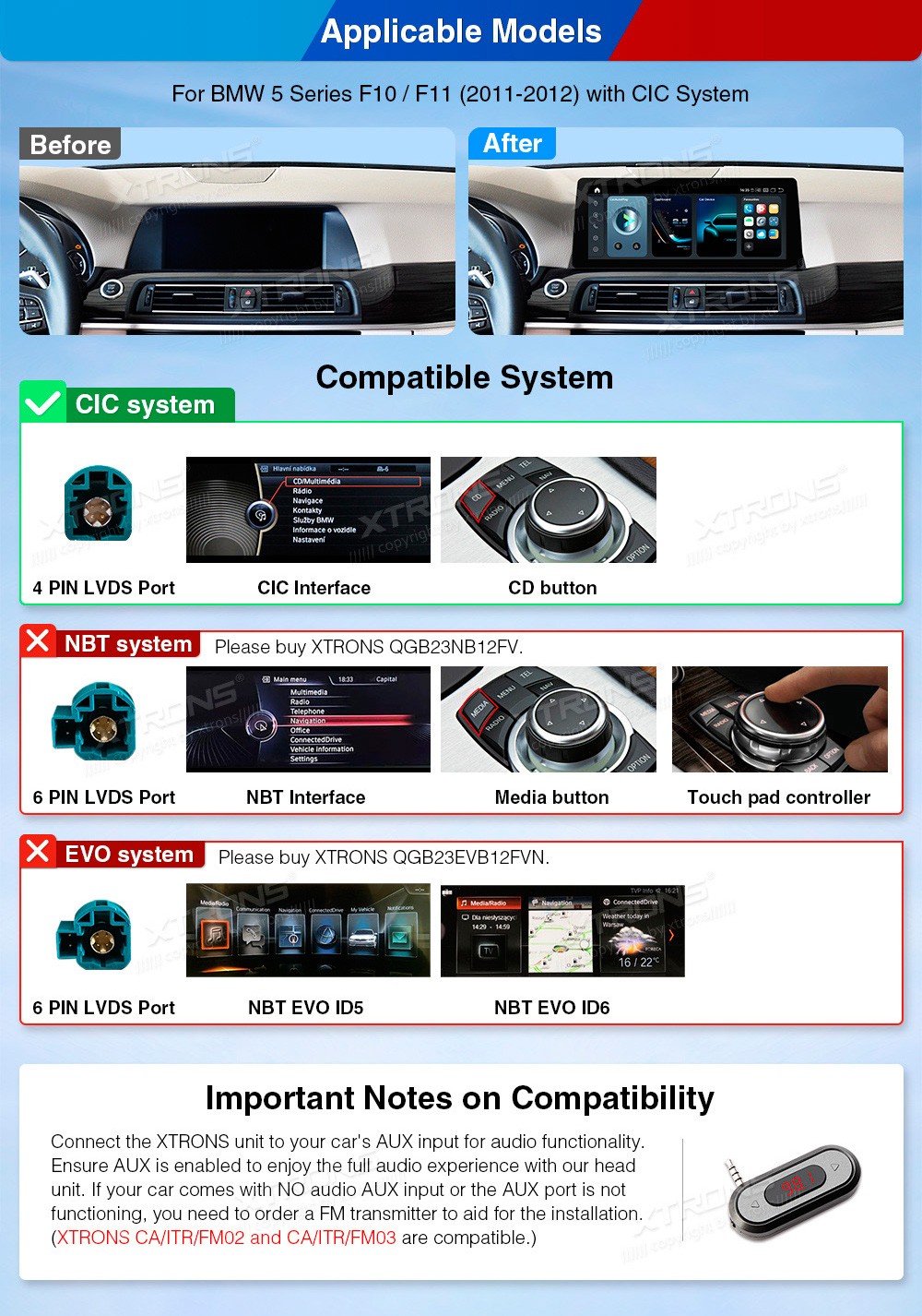 XTRONS QGB23CIB12FV 12.3" BMW 5 F10, F11 CIC Multimeedia Android 13.0 Octa-Core 4G BMW 5 Seeria F10, F11 (2011-2012) (Sobib, kui sõidukil on CIC süsteem.)Tarkvara: Android 13.012.3" 1920*720px, IPS G+G HD puuteekraanProtsessor Octa-Core Adreno T610 koos Kyro 256 2.4GHz 64bit, 6nmMuutmälu LPDDR4 8GB ...