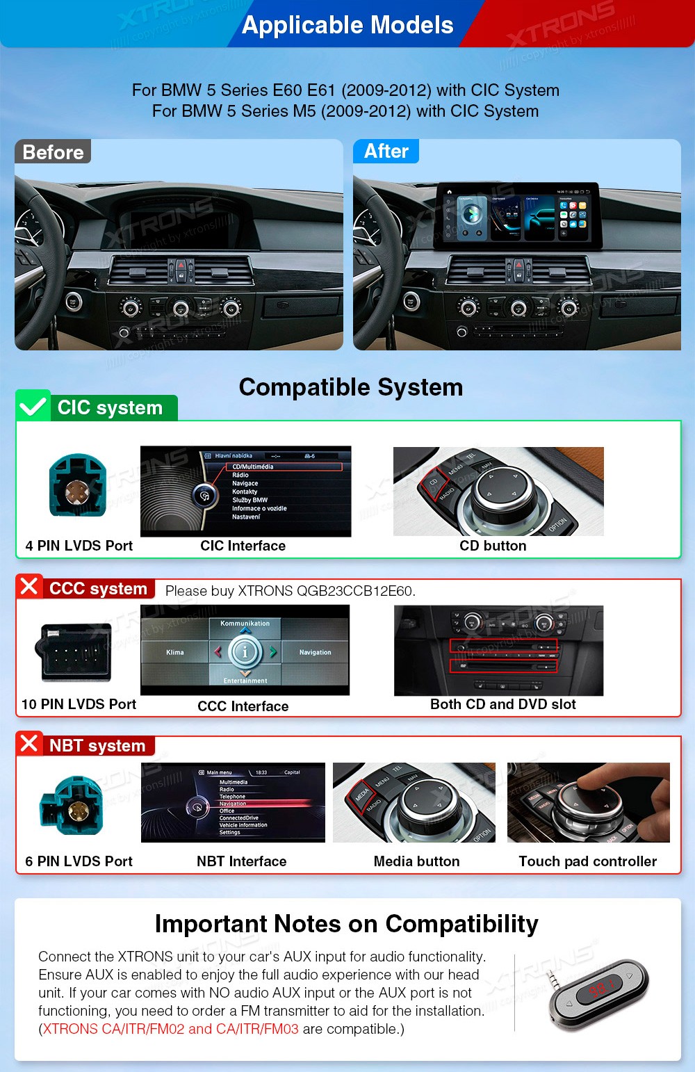 XTRONS QGB23CIB12E60 12.3" BMW 5 E60, E61, M5, CIC Multimeedia Android 13.0 Octa-Core 4G BMW 5 Seeria E60 E61 M5 (2009-2012) (Sobib, kui sõidukil on CIC süsteem.)Tarkvara: Android 13.012.3" 1920*720px, IPS G+G HD puuteekraanProtsessor Octa-Core Adreno T610 koos Kyro 256 2.4GHz 64bit, 6nmMuutmälu LPD ...