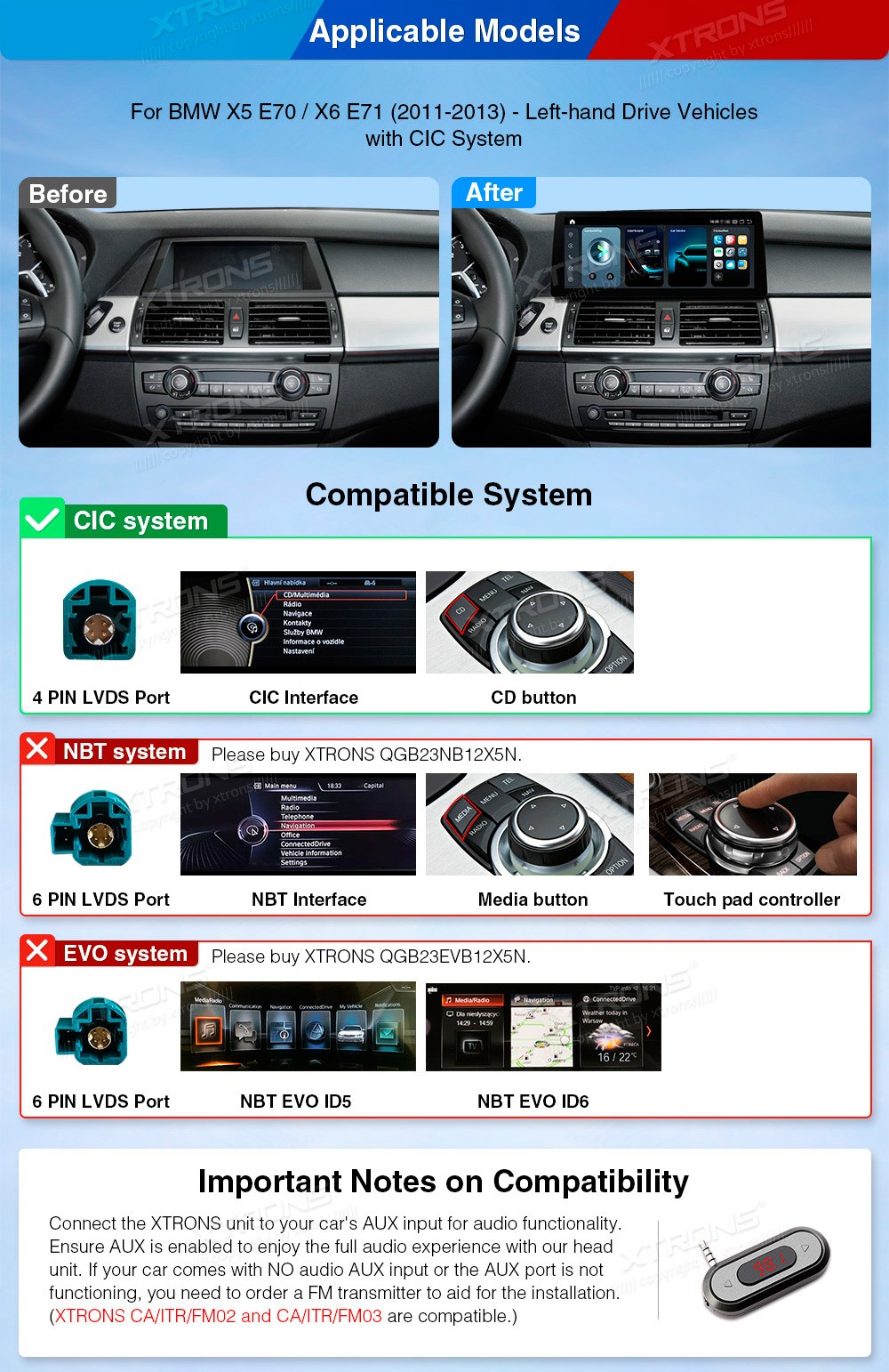 XTRONS QGB23CIB12X5L 12.3" BMW X5 E70, X6 E71, CIC Multimeedia Android 13.0 Octa-Core 4G BMW X5 E70 (2011-2013)BMW X6 E71 (2011-2013)(Sobib, kui sõidukil on CIC süsteem.)Tarkvara: Android 13.012.3" 1920*720px, IPS G+G HD puuteekraanProtsessor Octa-Core Adreno T610 koos Kyro 256 2.4GHz 64bit, 6nmMuut ...