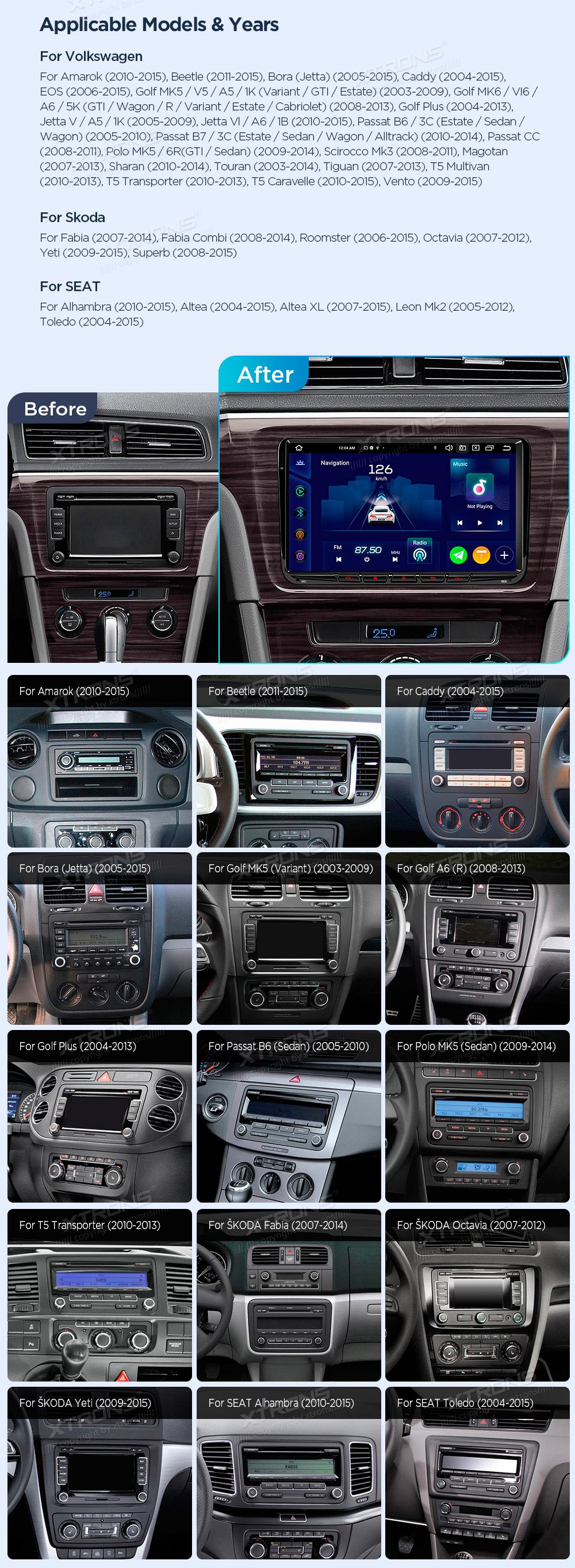 XTRONS IXA94MTVL 9.0" VW, Skosa, Seat Multimeedia Android 14.0 Octa-Core 4G VolkswagenAmarok (2010-2015), Beetle (2011-2015), Bora (Jetta) (2005-2015), Caddy (2004-2015), EOS (2006-2015), Golf MK5 / V5 / A5 / 1K (Variant / GTI / Estate) (2003-2009), Golf MK6 / VI6 / A6 / 5K (GTI / Wagon / R / ...