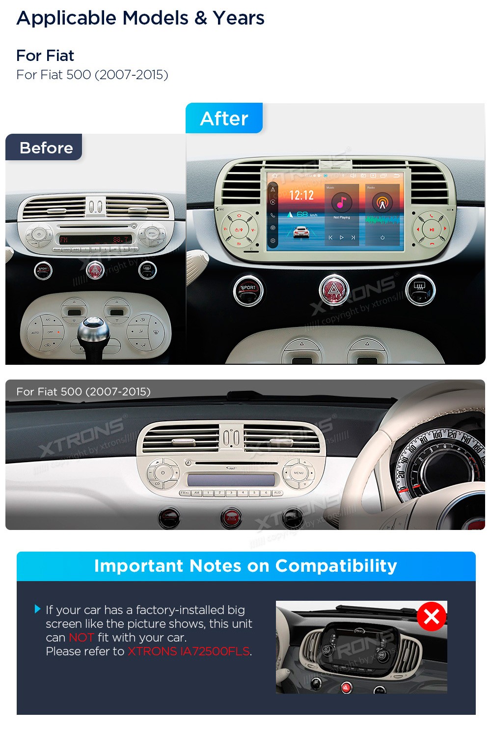 XTRONS PX7450FCL 7.0" FIAT 500 Multimeedia Android 14.0 Octa-Core 4G FIAT 500 (2007-2015)Tarkvara: Android 14.07.0" HD puuteekraan 1024*600px, IPSProtsessor  Octa-Core 64bit 2.0GHzMuutmälu 4GB DDR4, 64GB EMMC 5.1 sisemäluGPS NavigatsioonCAR AutoPlay (Bluetooth) AndroidAuto (Bluetooth ja juhtmeg ...
