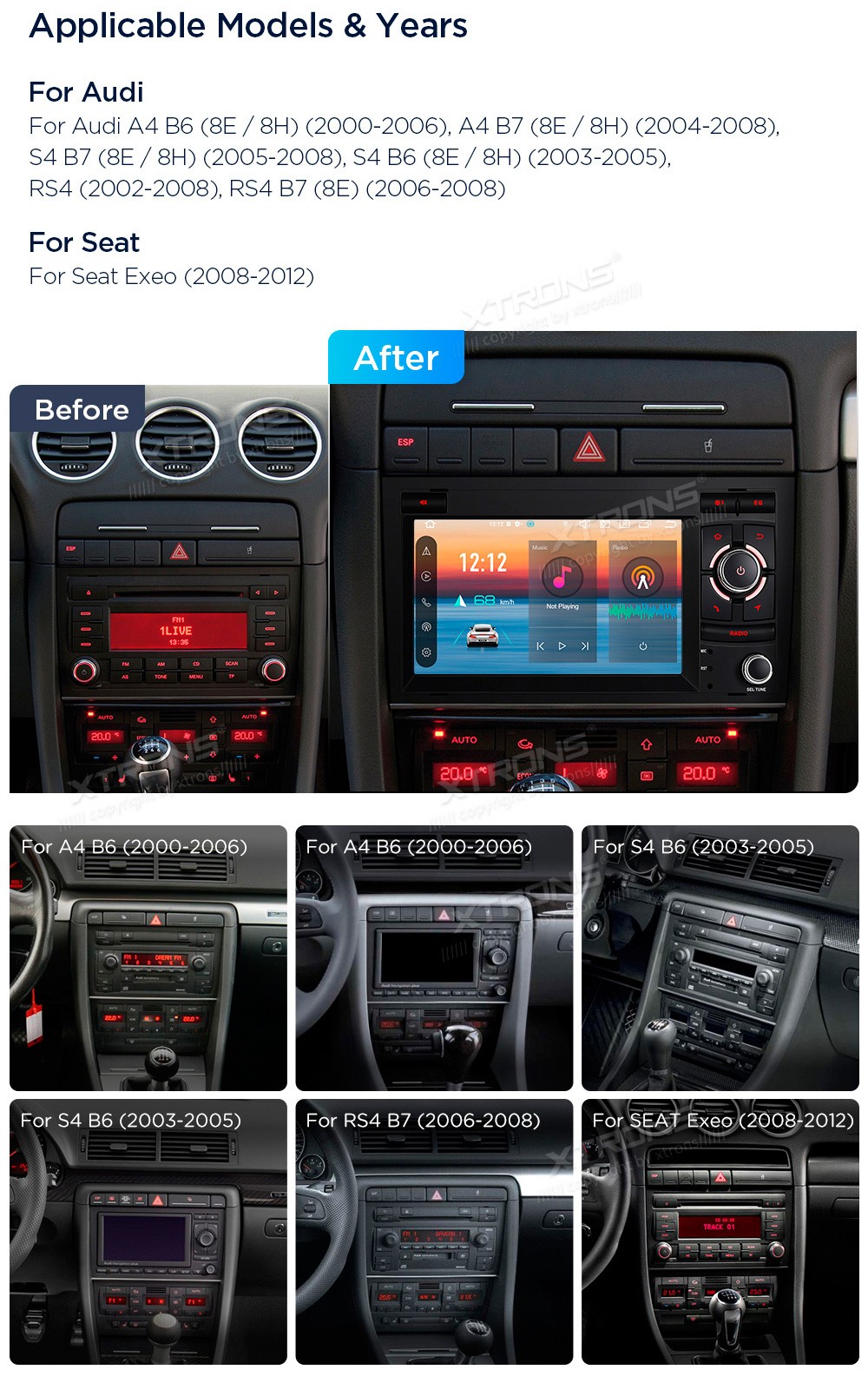 XTRONS PX74A4AL 7.0" AUDI A4, S4, RS4 Multimeedia Android 14.0 Octa-Core 4G Audi A4 B6 (8E / 8H) (2000-2006), A4 B7 (8E / 8H) (2004-2008), S4 B7 (8E / 8H) (2005-2008), S4 B6 (8E / 8H) (2003-2005), RS4 (2002-2008), RS4 B7 (8E) (2006-2008), SEAT Exeo (2008-2012)Tarkvara: Android 14.07.0" HD puutee ...