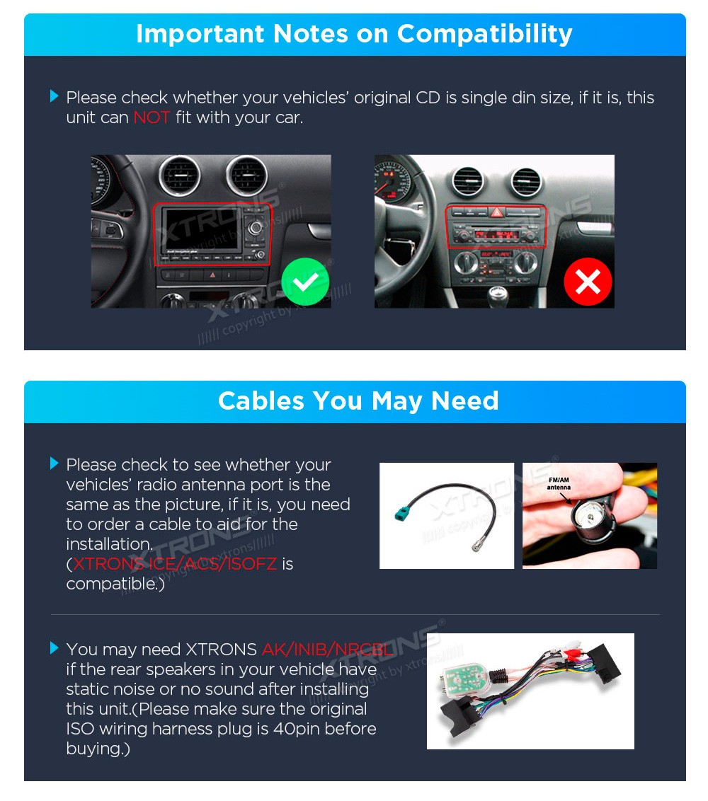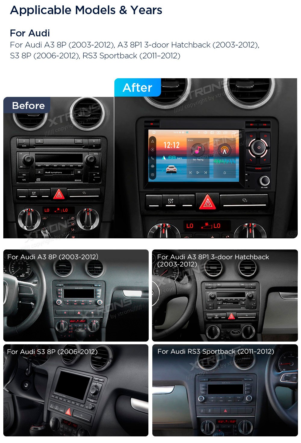 XTRONS PX74A3AL 7.0" AUDI A3, S3, RS3 Multimeedia Android 14.0 Octa-Core 4G Audi A3 8P (2003-2012), A3 8P1 3-door Hatchback (2003-2012), S3 8P (2006-2012), RS3 Sportback (2011-2012)Tarkvara: Android 14.07.0" HD puuteekraan 1024*600px, IPSProtsessor  Octa-Core 64bit 2.0GHzMuutmälu 4GB DDR4, 64GB ...