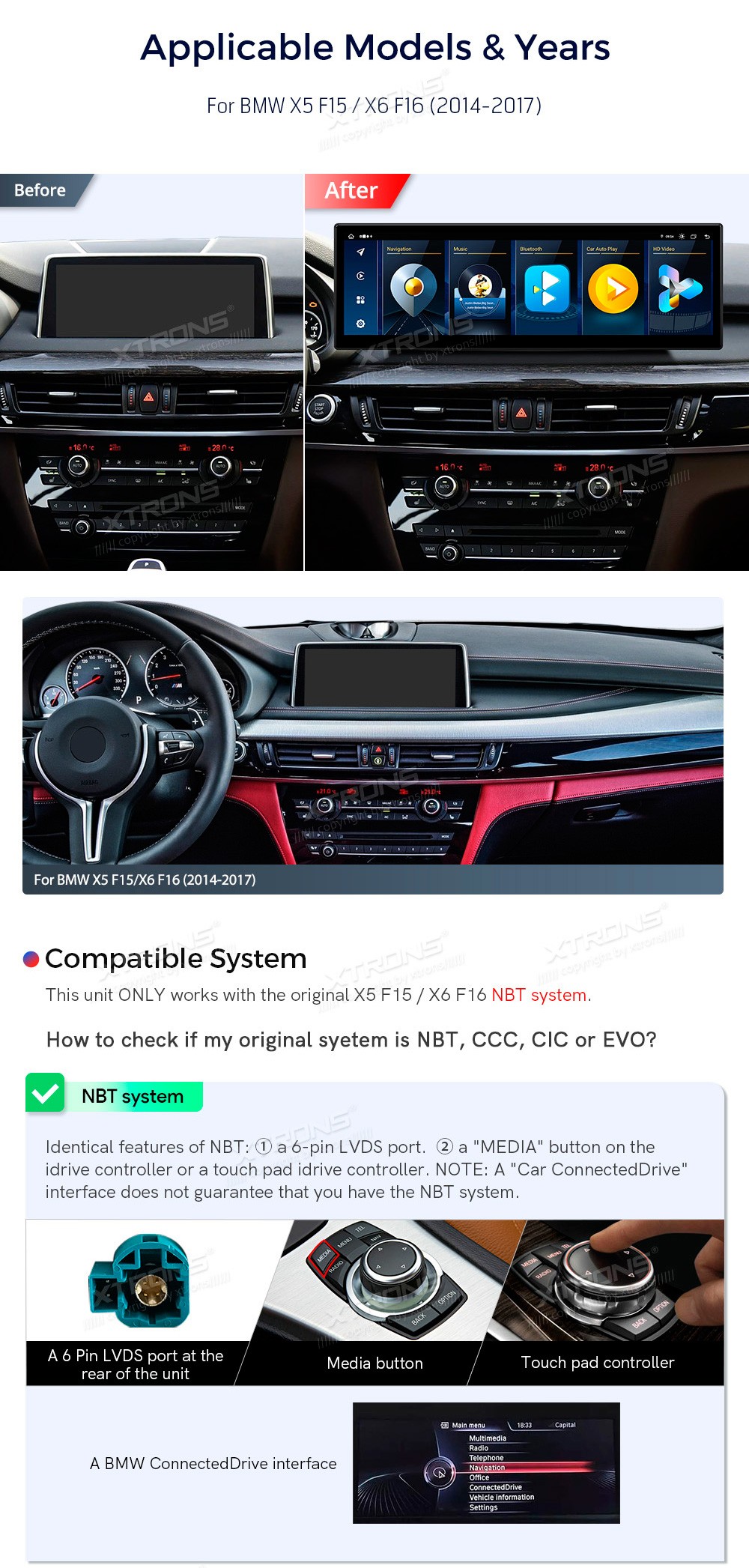 XTRONS QLBH44X5NB 14.9" BMW X5 F15, X6 F16 NBT Multimeedia Android 14.0 Octa-Core 4G BMW X5 F15 / X6 F16  (2014 - 2017) (Sobib, kui sõidukil on NBT süsteem.)Tarkvara: Android 14.014.9" 2560*720px, IPS G+G HD puuteekraanProtsessor Octa-Core 2x Cortex-A75 + 6x Cortex-A55 64bitMuutmälu LPDDR4 8GB, eMMC ...