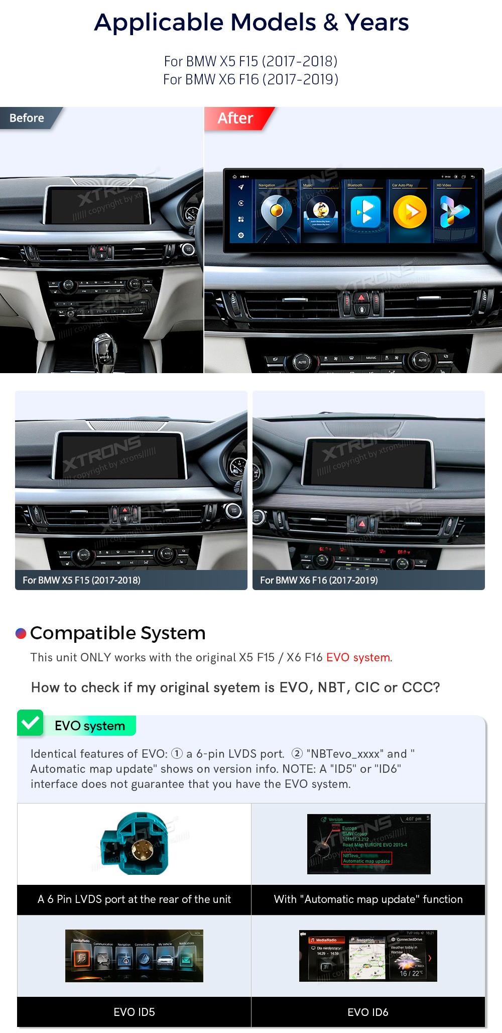 XTRONS QLBH44X5EV 14.9" BMW X5 F15, X6 F16 EVO Multimeedia Android 14.0 Octa-Core 4G BMW X5 F15 (2017-2018)BMW X6 F16 (2017-2019)(Sobib, kui sõidukil on EVO süsteem.)Tarkvara: Android 14.014.9" 2560*720px, IPS G+G HD puuteekraanProtsessor Octa-Core 2x Cortex-A75 + 6x Cortex-A55 64bitMuutmälu LPDDR4 ...