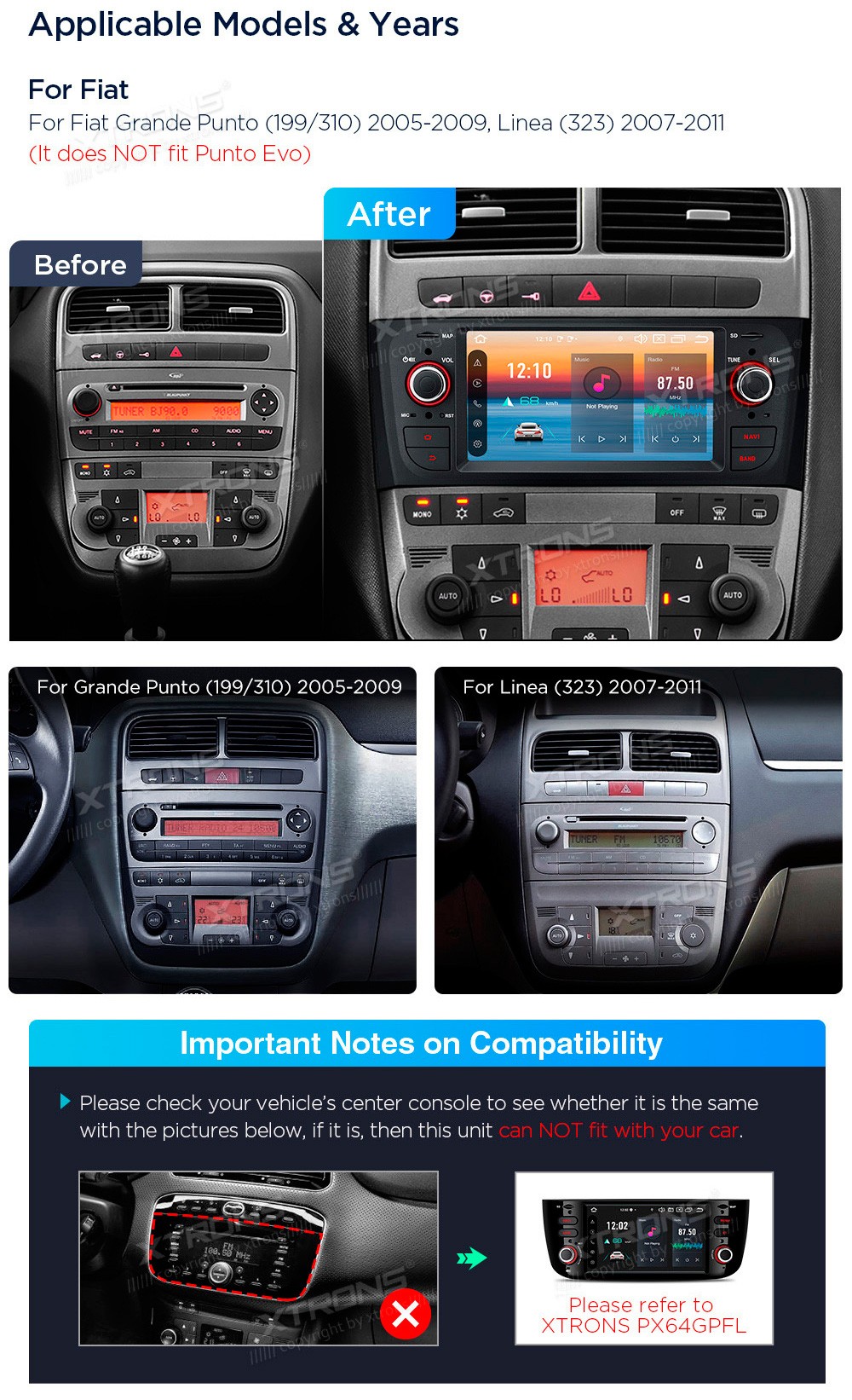XTRONS PX64PTFL 7.0" FIAT Grande Punto, Linea Multimeedia Android 14.0 Octa-Core 4G FIAT Grande Punto (199/310) (2005-2009)Linea (323) (2007-2011) (It does NOT fit Punto Evo)Tarkvara: Android 14.06.1" HD puuteekraan 800*480px, IPSProtsessor  Octa-Core 64bit 2.0GHzMuutmälu 4GB DDR4, 64GB EMMC 5 ...