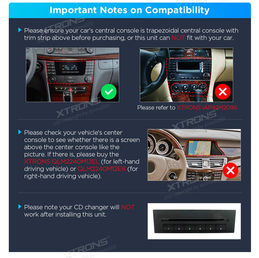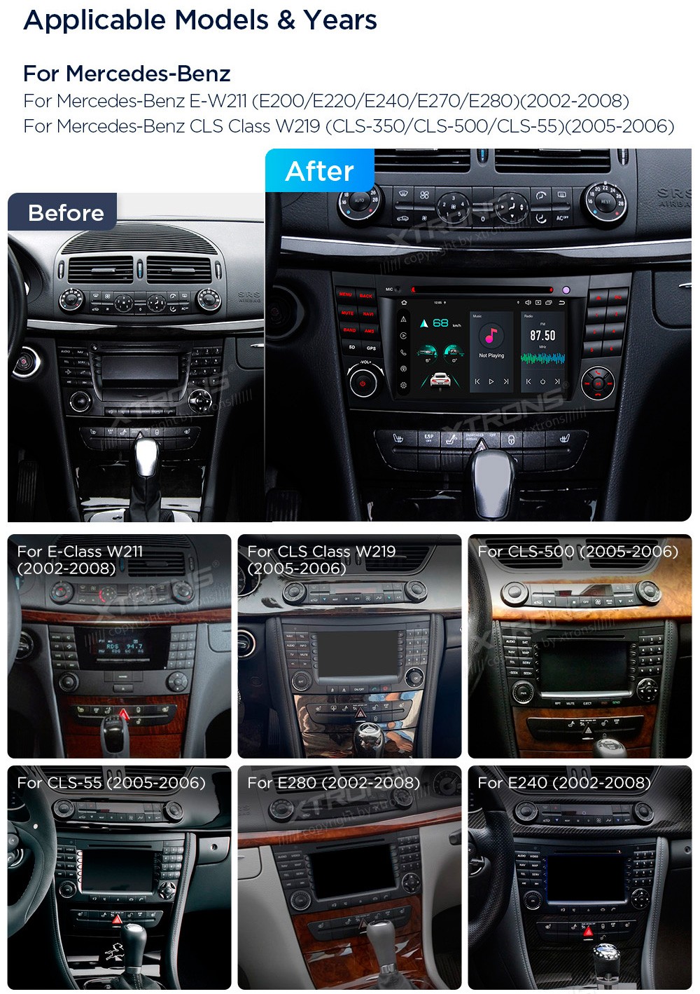 XTRONS PX74M211G 7.0" Mercedes-Benz W211, W219 Multimeedia Android 14.0 Octa-Core 4G Mercedes-Benz E-Class W211 (E200 / E220 / E240 / E270 / E280) (2002-2008)CLS Class W219 (CLS-350 / CLS-500 / CLS-55) (2005-2006)Tarkvara: Android 14.07.0" HD puuteekraan 1280*720px, IPSProtsessor  Octa-Core 64b ...