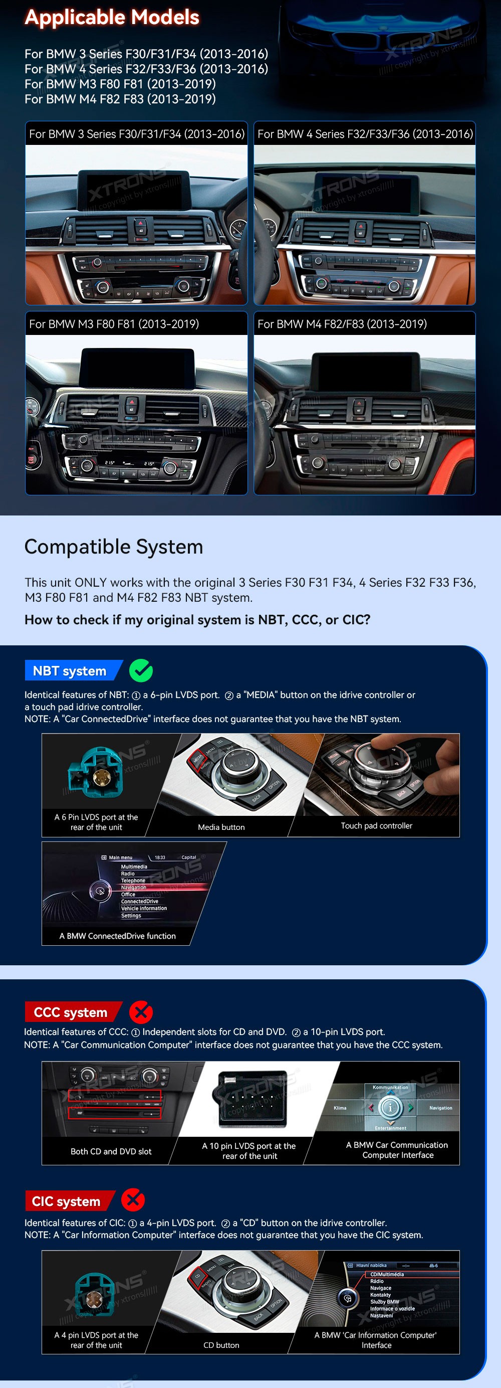 XTRONS QDB10NBTH 10.25" BMW 3, 4 Seeria NBT Multimeedia Android Octa-Core 4G BMW 3 Series F30, F31, F34 (2013-2016)BMW 4 Series F32, F33, F36 (2013-2016)BMW M3 F80, F81 (2013-2019)BMW M4 F82, F83 (2013-2019)(Sobib, kui sõidukil on NBT süsteem.)Tarkvara: Android10.25" HD puuteekraan 1920*720px, IPS H ...