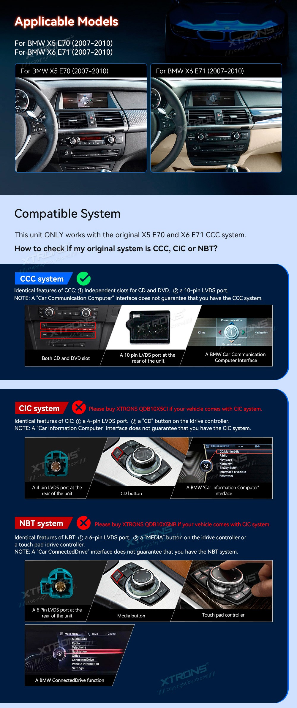 XTRONS QDB10X5CC 10.25" BMW X5 E70, X6 E71 CCC Multimeedia Android Octa-Core 4G BMW X5 E70 (2007-2010)BMW X6 E71 (2007-2010)(Sobib, kui sõidukil on CCC süsteem.)Tarkvara: Android10.25" HD puuteekraan 1920*720px, IPS HDProtsessor TM A55 Octa-Core 64bitMuutmälu LPDDR4 4GB, UEF2.2 64GB sisemäluGPS Navi ...