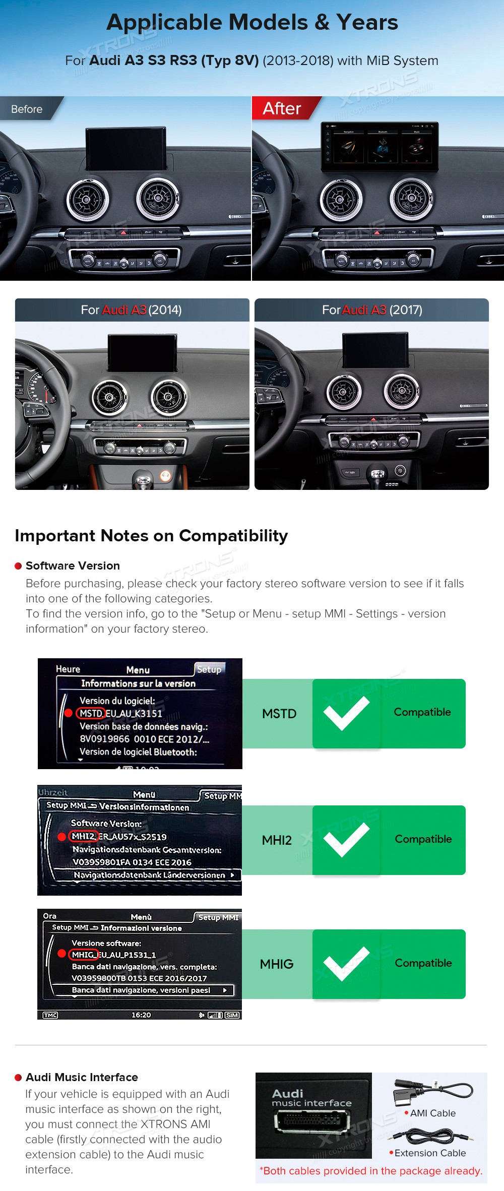 XTRONS QLA23A3 12.3" AUDI A3, S3, RS3 MiB Multimeedia Android 13.0 Octa-Core 4G Audi A3, S3, RS3 (Typ 8V) (2013-2018) MiB SystemTarkvara: Android 13.012.3" HD puuteekraan 1920*720px, IPS HDProtsessor Octa-Core 2xCortex-A75 2.0GHz + 6xCortex-A55 1.7GHz 64bitMuutmälu LPDDR4 4GB, eMMC 64GB sisemäluGPS ...