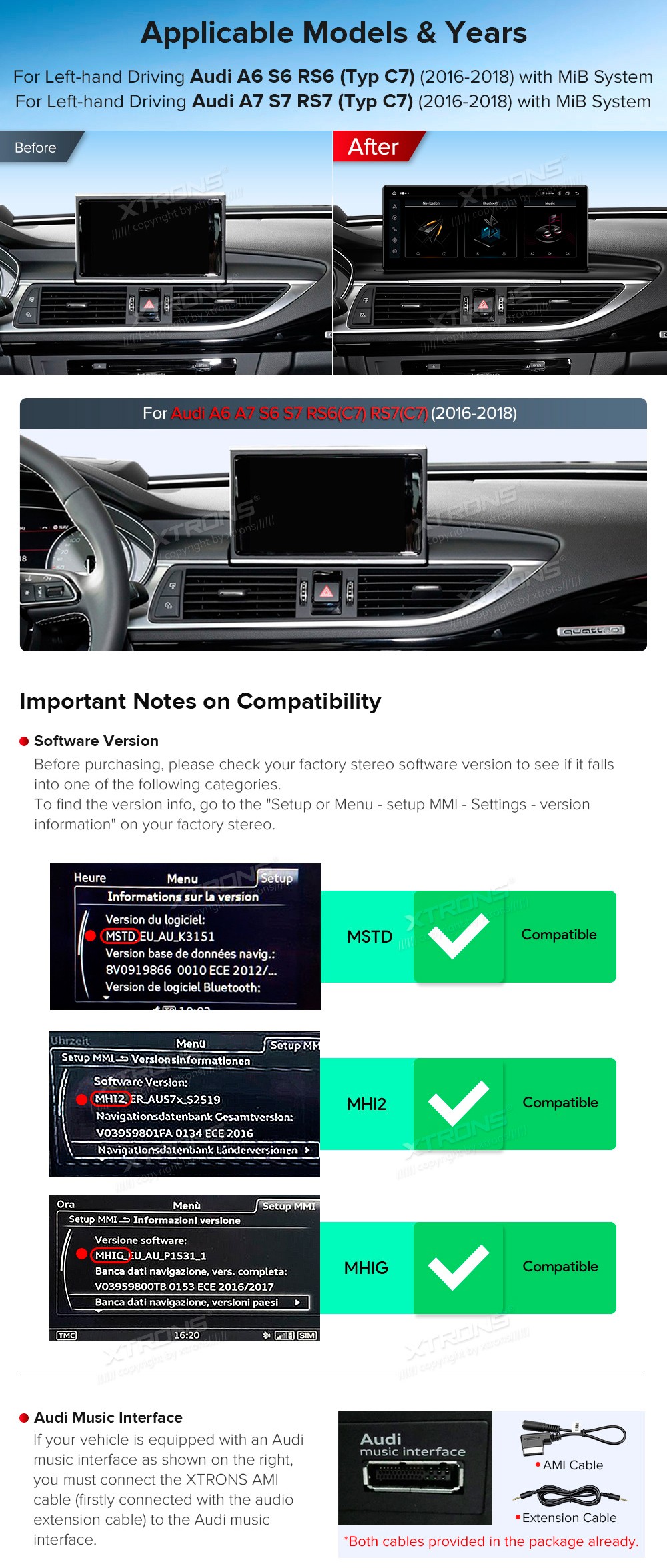 XTRONS QLA23A6NL 12.3" AUDI A6, A7 MiB Multimeedia Android 13.0 Octa-Core 4G Audi A6, RS6, S6 (Typ C7) (2016-2018) MIB SystemAudi A7, RS7, S7 (Typ C7) (2016-2018) MIB SystemTarkvara: Android 13.012.3" HD puuteekraan 1920*720px, IPS HDProtsessor Octa-Core 2xCortex-A75 2.0GHz + 6xCortex-A55 1.7GHz 64b ...