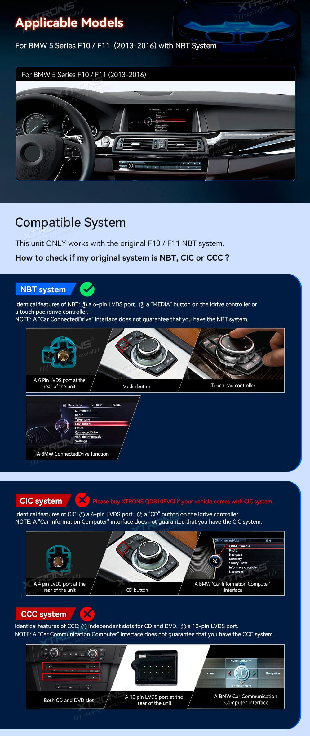 XTRONS QDB10FVNB 10.25" BMW 5 Seeria F10, F11 NBT Multimeedia Android Octa-Core 4G BMW 5 Seeria F10 / F11 (2013-2016) (Sobib, kui sõidukil on NBT süsteem.)Tarkvara: Android10.25" HD puuteekraan 1920*720px, IPS HDProtsessor Cortex TM A55 Octa-Core 64bitMuutmälu LPDDR4 4GB, UEF2.2 64GB sisemäluGPS Nav ...