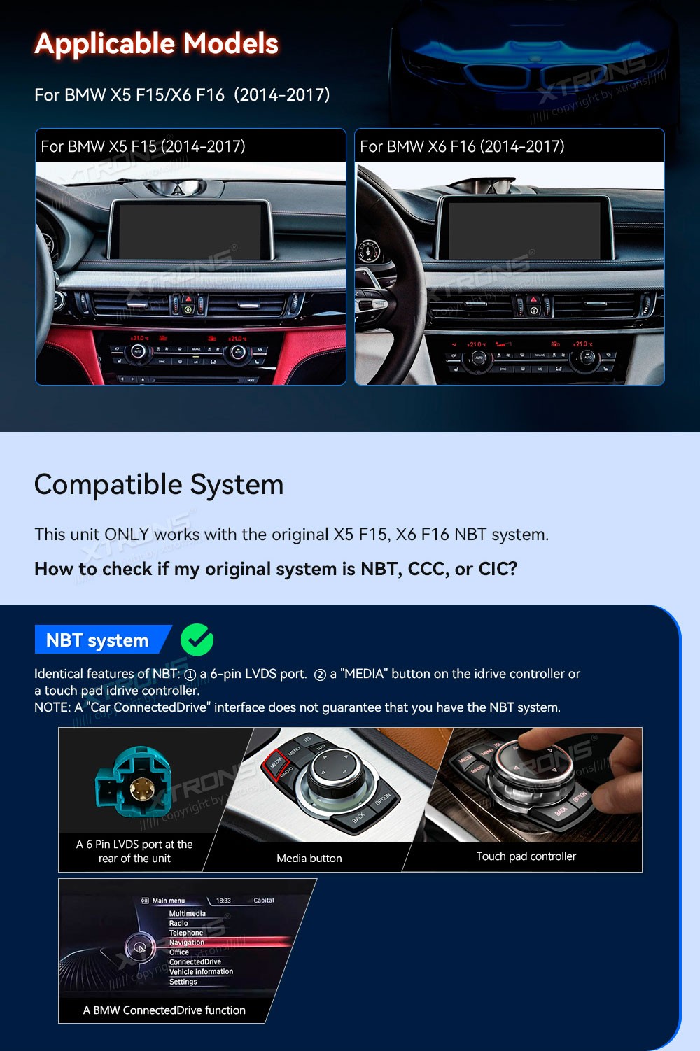 XTRONS QDB10X5NB 10.25" BMW X5 F15, X6 F16 NBT Multimeedia Android Octa-Core 4G BMW X5 F15 / X6 F16  (2014 - 2017) (Sobib, kui sõidukil on NBT süsteem.)Tarkvara: Android10.25" HD puuteekraan 1920*720px, IPS HDProtsessor Cortex TM A55 Octa-Core 64bitMuutmälu LPDDR4 4GB, UEF2.2 64GB sisemäluGPS Naviga ...
