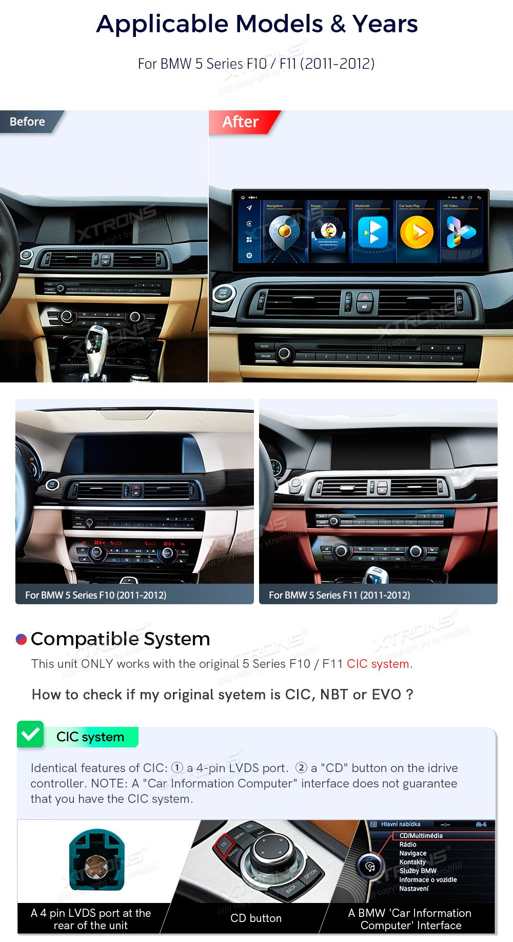 XTRONS QLBH44FVCI 14.9" BMW 5 Seeria F10, F11 CIC Multimeedia Android 14.0 Octa-Core 4G BMW 5 Seeria F10 / F11 (2011-2012) (Sobib, kui sõidukil on CIC süsteem.)Tarkvara: Android 14.014.9" 2560*720px, IPS G+G HD puuteekraanProtsessor Octa-Core 2x Cortex-A75 + 6x Cortex-A55 64bitMuutmälu LPDDR4 8GB, e ...