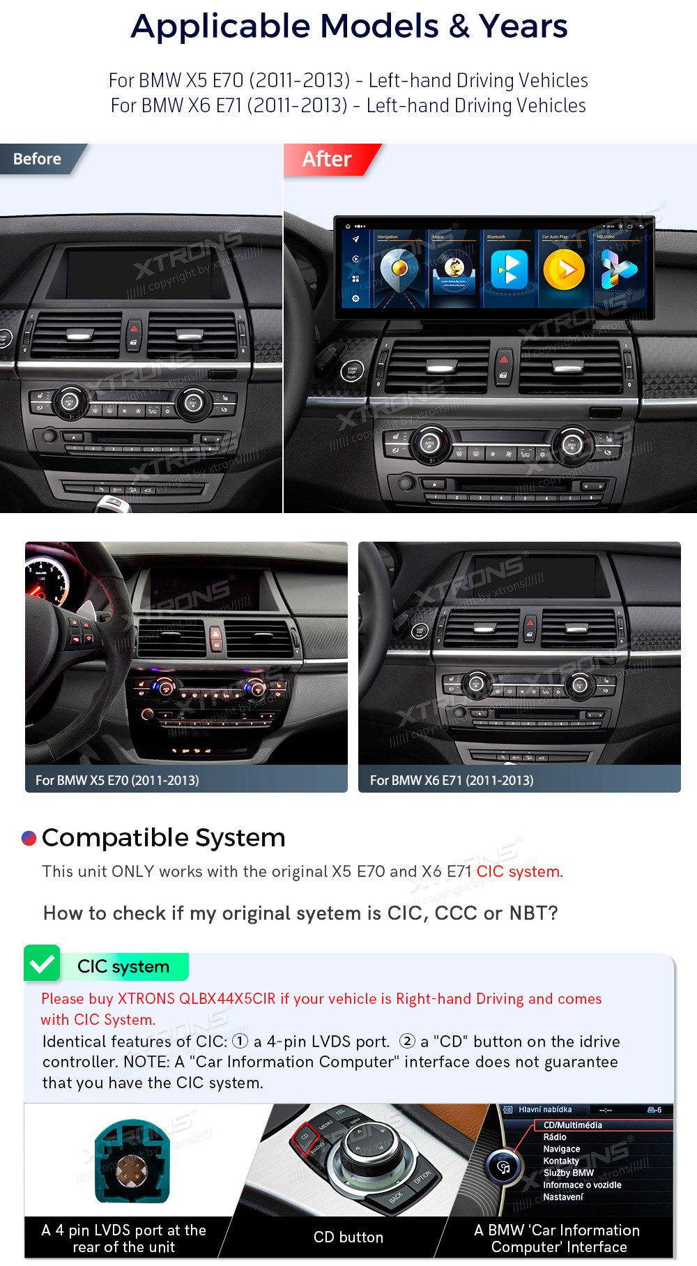 XTRONS QLBX44X5CIL 14.9" BMW X5 E70, X6 E71 CIC Multimeedia Android 14.0 Octa-Core 4G BMW X5 E70 (2011-2013)BMW X6 E71 (2011-2013)(Sobib, kui sõidukil on CIC süsteem.)Tarkvara: Android 14.014.9" 1920*1080px, IPS G+G HD puuteekraanProtsessor Octa-Core 2x Cortex-A75 + 6x Cortex-A55 64bitMuutmälu LPDDR ...