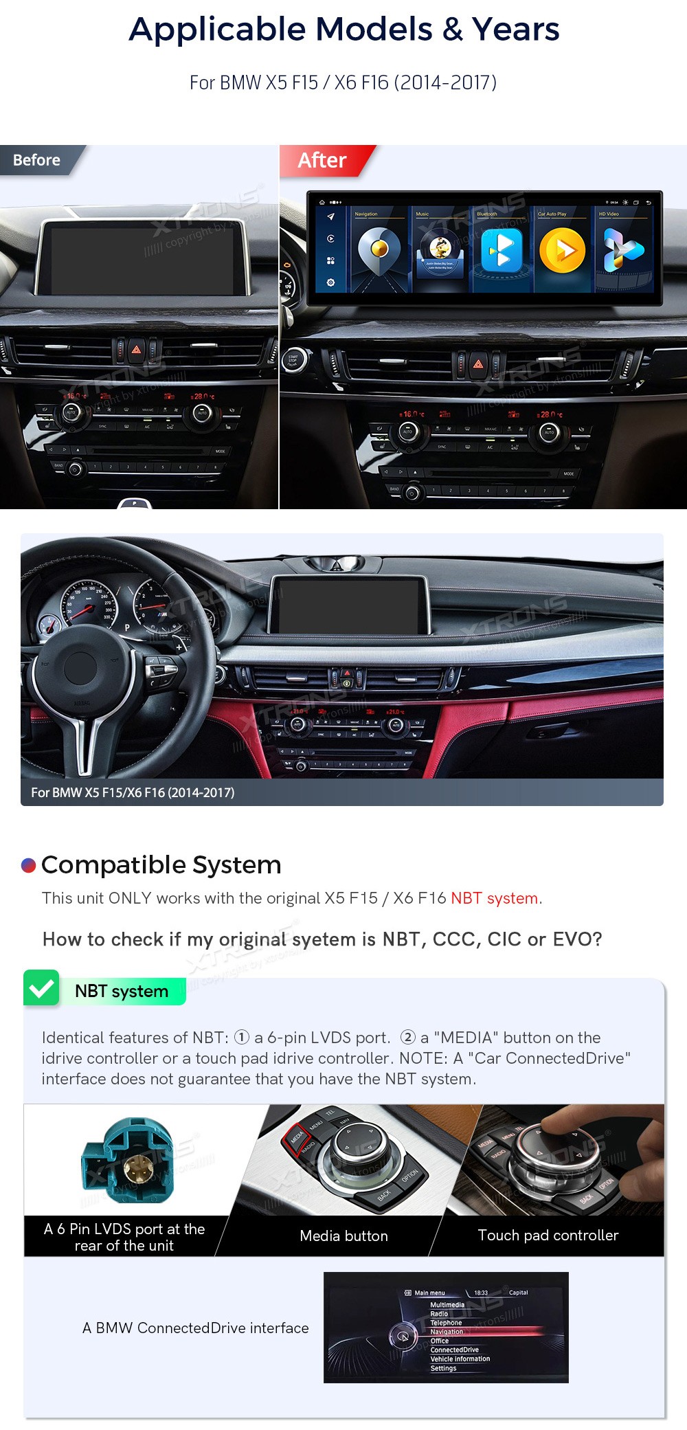 XTRONS QLBX44X5NB 14.9" BMW X5 F15, X6 F16 NBT Multimeedia Android 14.0 Octa-Core 4G BMW X5 F15 (2014-2017)BMW X6 F16 (2014-2017)(Sobib, kui sõidukil on NBT süsteem.)Tarkvara: Android 14.014.9" 1920*1080px, IPS G+G HD puuteekraanProtsessor Octa-Core 2x Cortex-A75 + 6x Cortex-A55 64bitMuutmälu LPDDR4 ...