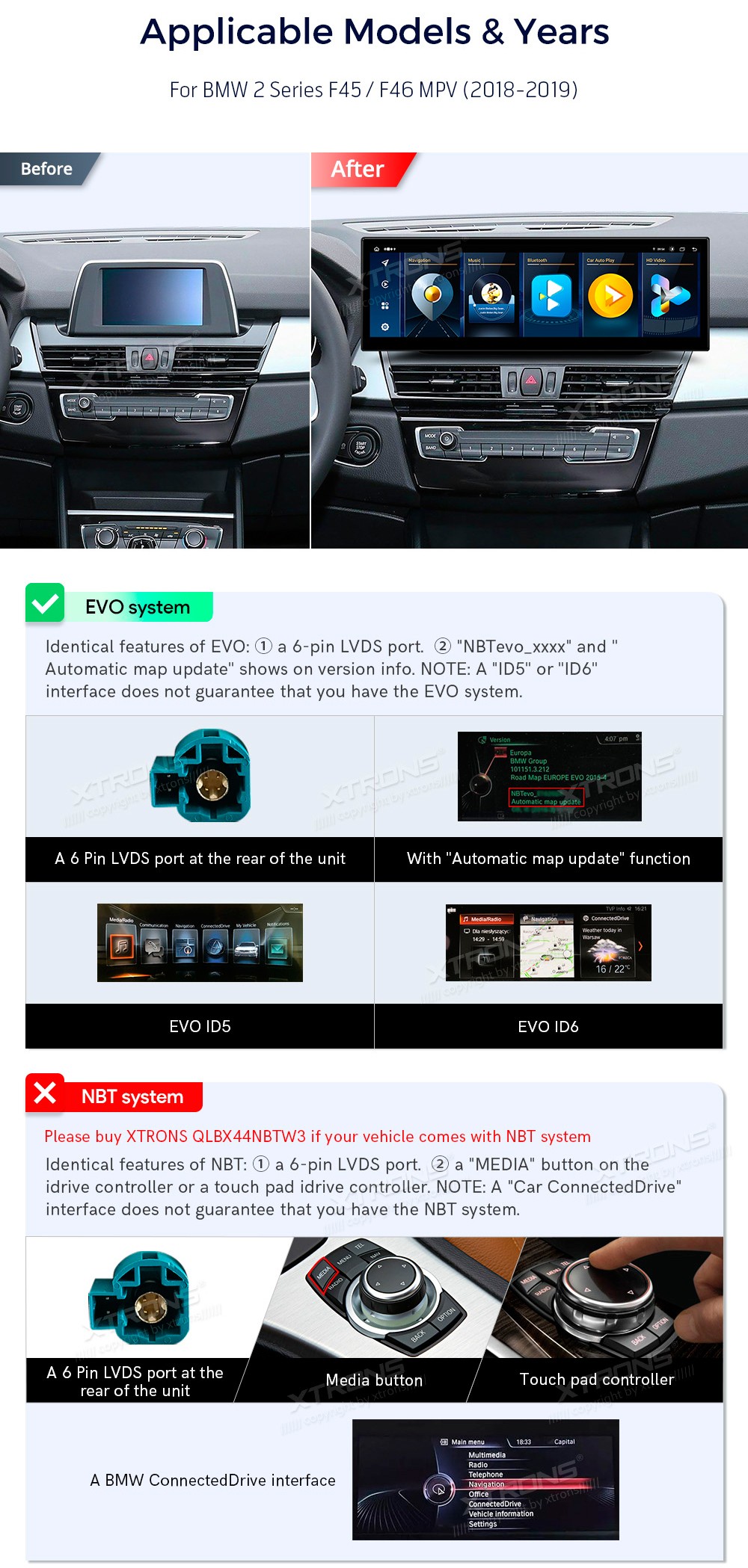 XTRONS QLBX44EVTW3 14.9" BMW 2 Seeria F45, F46 MPV EVO Multimeedia Android 14.0 Octa-Core 4G BMW 2 Seeria F45, F46 MPV (2018-2019) (Sobib, kui sõidukil on EVO süsteem.)Tarkvara: Android 14.014.9" 1920*1080px, IPS G+G HD puuteekraanProtsessor Octa-Core 2x Cortex-A75 + 6x Cortex-A55 64bitMuutmälu LPDD ...