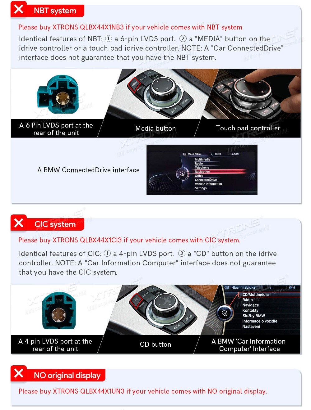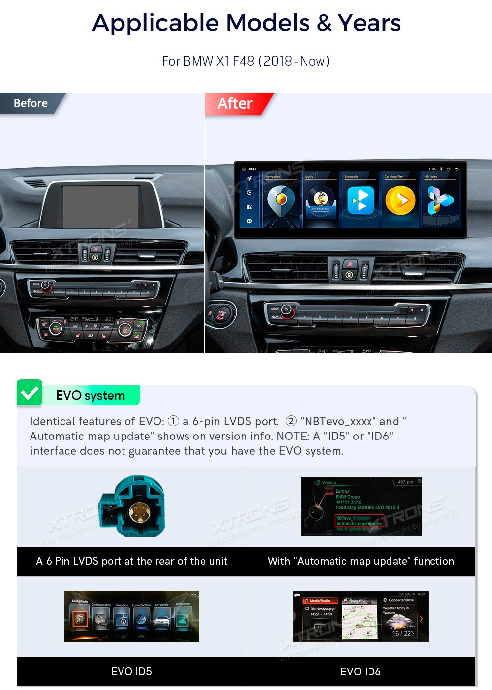 XTRONS QLBX44X1EV3 14.9" BMW X1 F48 EV Multimeedia Android 14.0 Octa-Core 4G BMW X1 F48 (2018- ) (Sobib, kui sõidukil on EVO süsteem.)Tarkvara: Android 14.014.9" 1920*1080px, IPS G+G HD puuteekraanProtsessor Octa-Core 2x Cortex-A75 + 6x Cortex-A55 64bitMuutmälu LPDDR4 8GB, eMMC 256GB sisemäluGPS Nav ...