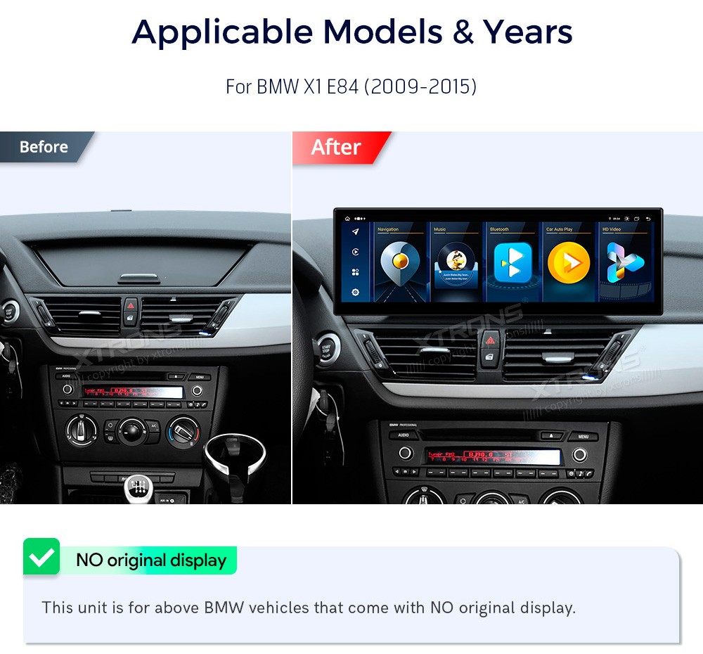 XTRONS QLBX44X1UN3 14.9" BMW X1 E84 Multimeedia Android 14.0 Octa-Core 4G BMW X1 E84 (2009-2015) (Kui autol puudub originaalne ekraan.)Tarkvara: Android 14.014.9" 1920*1080px, IPS G+G HD puuteekraanProtsessor Octa-Core 2x Cortex-A75 + 6x Cortex-A55 64bitMuutmälu LPDDR4 8GB, eMMC 256GB sisemäluGPS Na ...