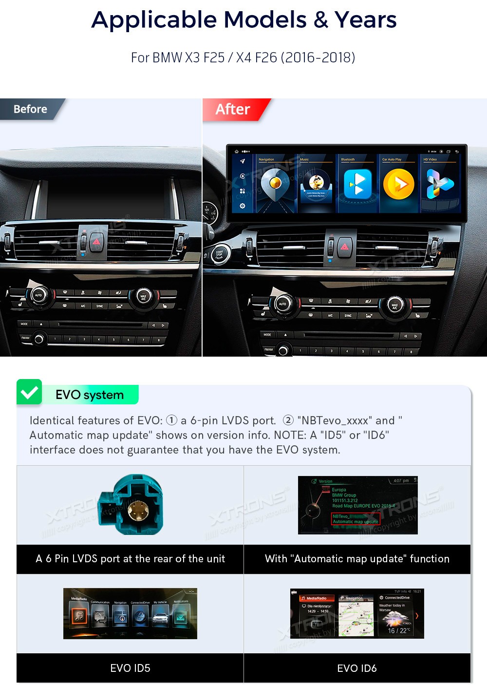 XTRONS QLBX44X3EV3 14.9" BMW X3 F25, X4 F26 EVO Multimeedia Android 14.0 Octa-Core 4G BMW X3 F25/X4 F26 (2016-2018) (Sobib, kui sõidukil on EVO süsteem.)Tarkvara: Android 14.014.9" 1920*1080px, IPS G+G HD puuteekraanProtsessor Octa-Core 2x Cortex-A75 + 6x Cortex-A55 64bitMuutmälu LPDDR4 8GB, eMMC 25 ...