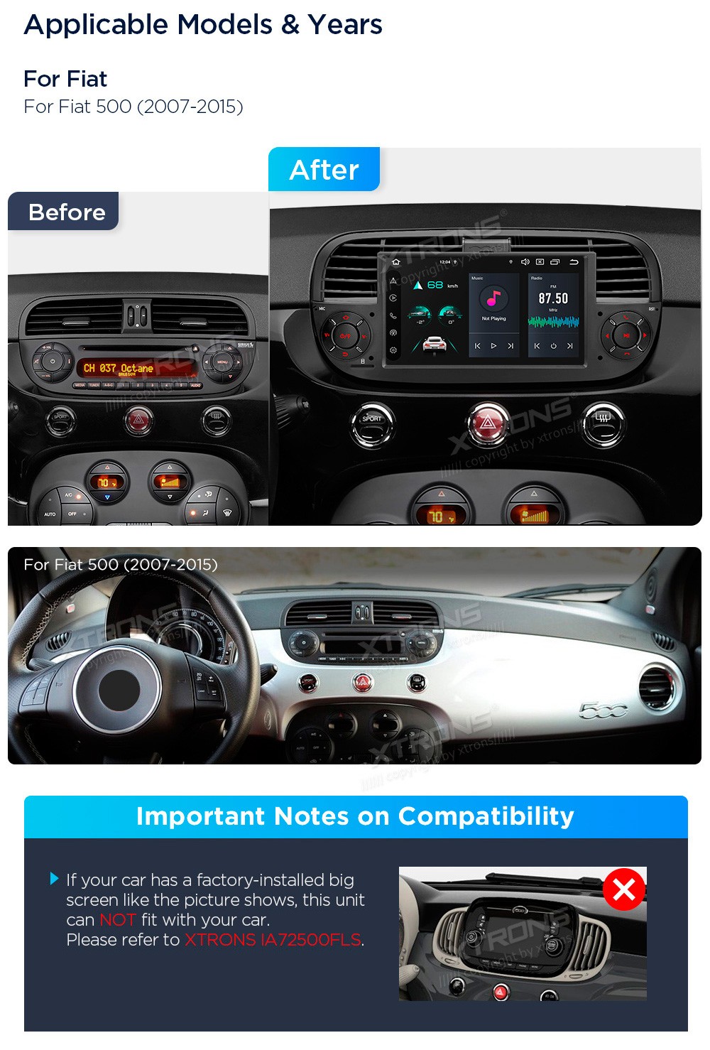 XTRONS PX7450FBLGS 7.0" FIAT 500 Multimeedia Android 14.0 Octa-Core FIAT 500 (2007-2015)Tarkvara: Android 14.07.0" HD puuteekraan 1024*600px, IPSProtsessor  Octa-Core 64bit 2.0GHzMuutmälu 4GB DDR4, 64GB EMMC 5.1 sisemäluGPS NavigatsioonCAR AutoPlay (Bluetooth) AndroidAuto (Bluetooth ja juh ...