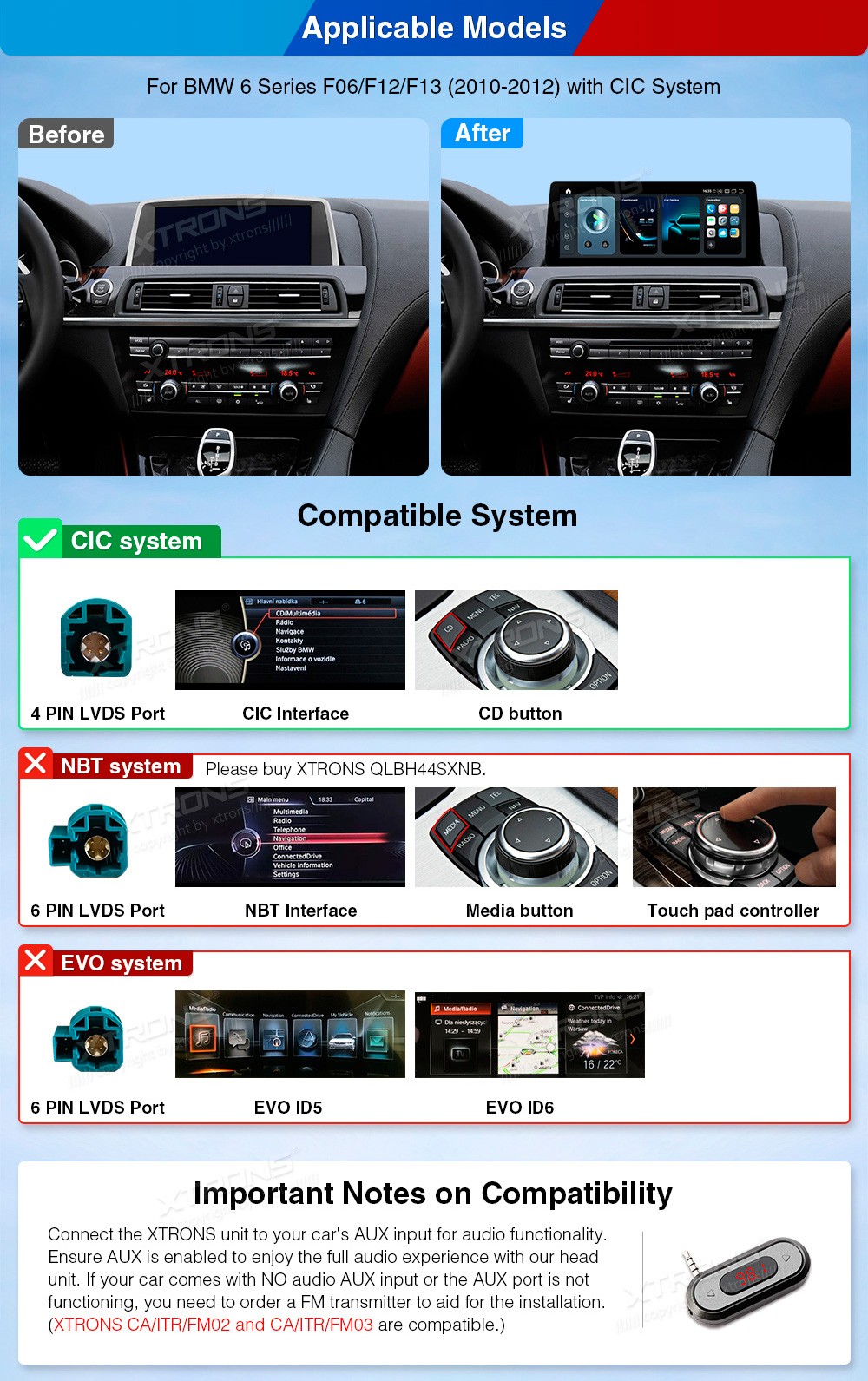 XTRONS QGB23CISX 12.3" BMW 6 Seeria F06, F12, F13 CIC Multimeedia Android 13.0 Octa-Core 4G BMW 6 Seeria F06, F12, F13 (2010-2012) (Sobib, kui sõidukil on CIC süsteem.)Tarkvara: Android 13.012.3" 1920*720px, IPS G+G HD puuteekraanProtsessor Octa-Core Adreno T610 koos Kyro 256 2.4GHz 64bit, 6nmMuutmä ...