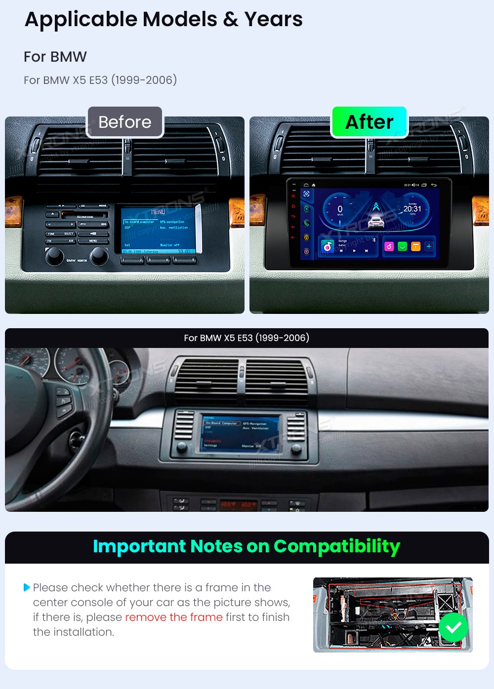XTRONS IDP9053B 9.0" BMW X5 E53 Multimeedia Android Octa-Core 4G BMW X5 E53 (1999-2006)Tarkvara: Android9.0" HD puuteekraan 1280*720px, G+G IPSProtsessor 8xCortex-A55 Octa-Core 64bitMuutmälu DDR4 4GB, 64GB sisemäluGPS NavigatsioonCAR AutoPlay (Bluetooth ja USB) AndroidAuto (Bluetooth ja USB)HDMI väl ...