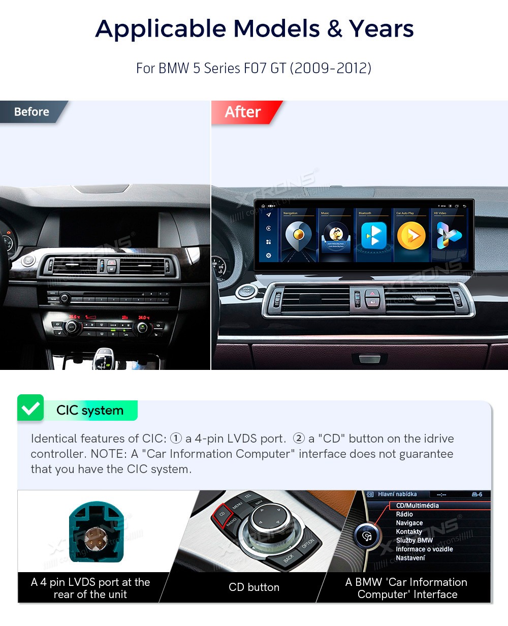 XTRONS QLB42FVCIGT3 14.9" BMW 5 Seeria F07 GT CIC Multimeedia Android 13.0 Octa-Core 4G BMW 5 Seeria F07 GT (2009-2012) (Sobib, kui sõidukil on CIC süsteem.)Tarkvara: Android 13.014.9" HD puuteekraan 2560*720px, IPS HDProtsessor Octa-Core 2xCortex-A75 2.0GHz + 6xCortex-A55 1.7GHz 64bitMuutmälu ...